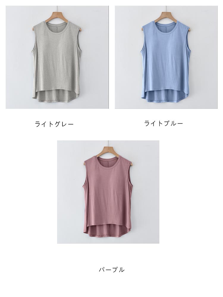 | 胸が目立たないようにパッドが付いたタンクトップです。 フロントがショート丈になったお洒落なデザイン。 前面のみ、パッドは縫われて固定されているためズレません。 ほどよく前面がフィットし、締め付け感なしでリラックスしたい休日などにぴったりです。 旅行や出張での長時間移動に。ホテル内や旅館内でのリラックスウェアに。インナーシャツとしても便利です。 やわらかくもっちりとした肌に気持ちいいモダール生地。 | |