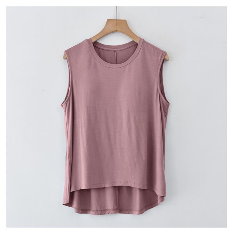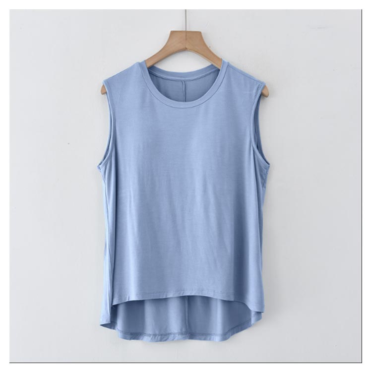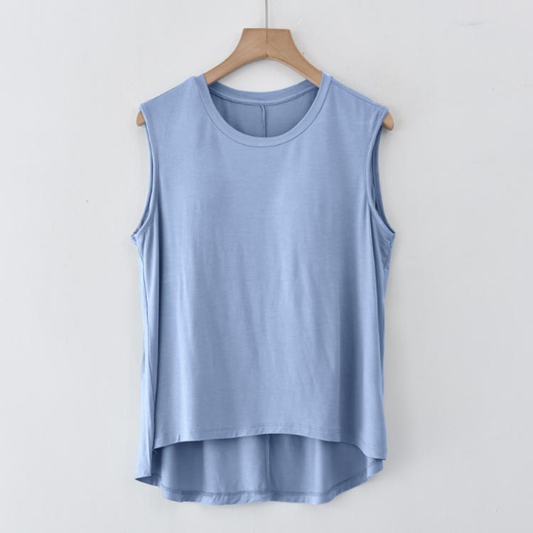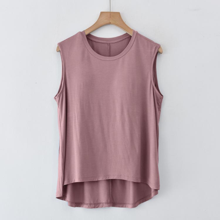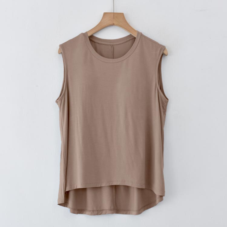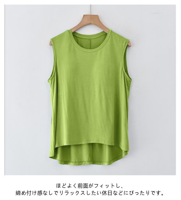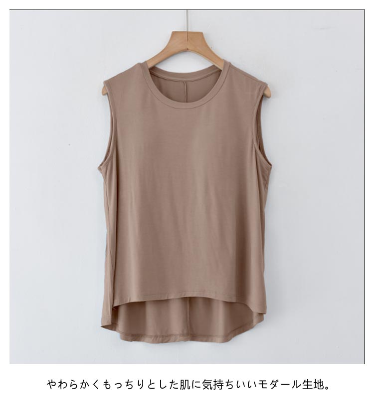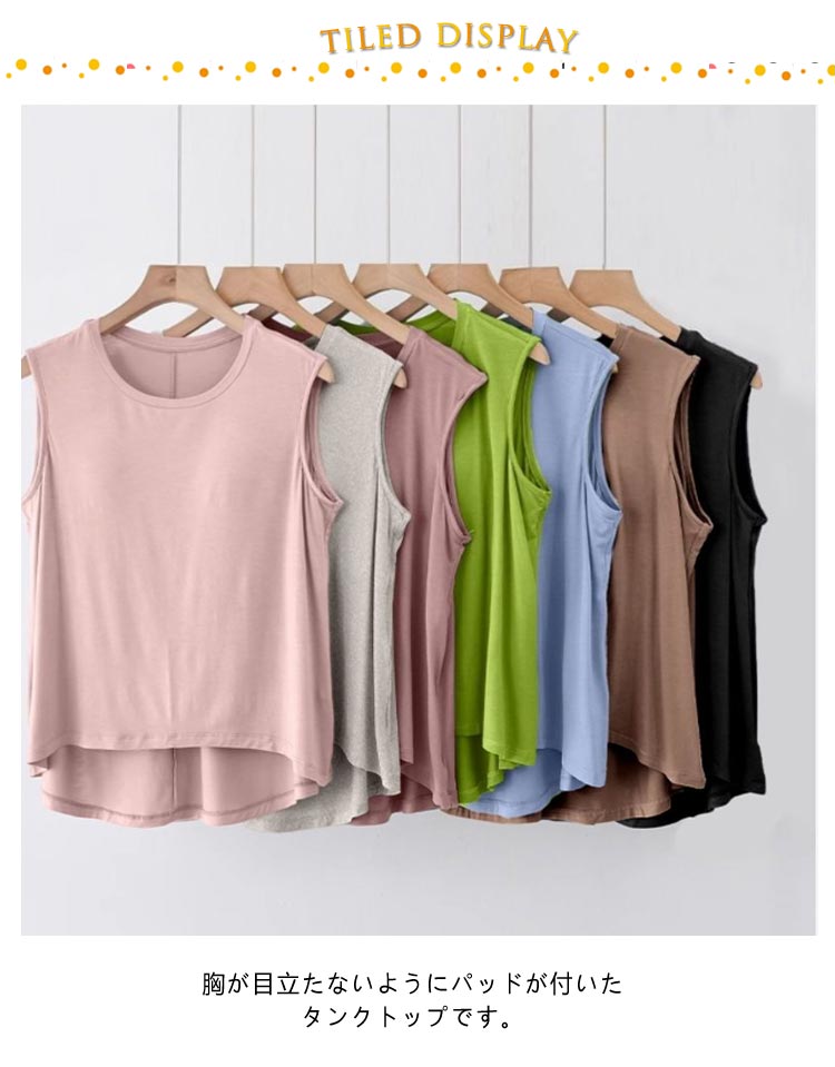胸が目立たないようにパッドが付いたタンクトップです。フロントがショート丈になったお洒落なデザイン。前面のみ、パッドは縫われて固定されているためズレません。ほどよく前面がフィットし、締め付け感なしでリラックスしたい休日などにぴったりです。旅行や出張での長時間移動に。ホテル内や旅館内でのリラックスウェアに。インナーシャツとしても便利です。やわらかくもっちりとした肌に気持ちいいモダール生地。