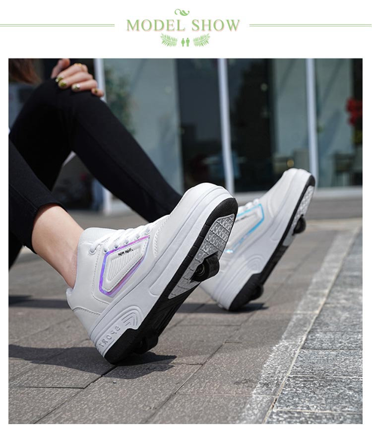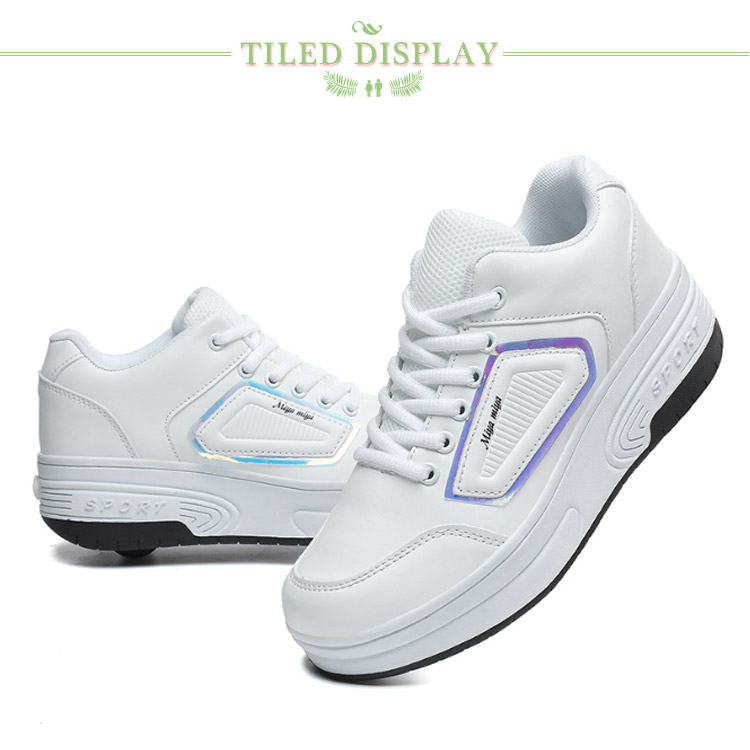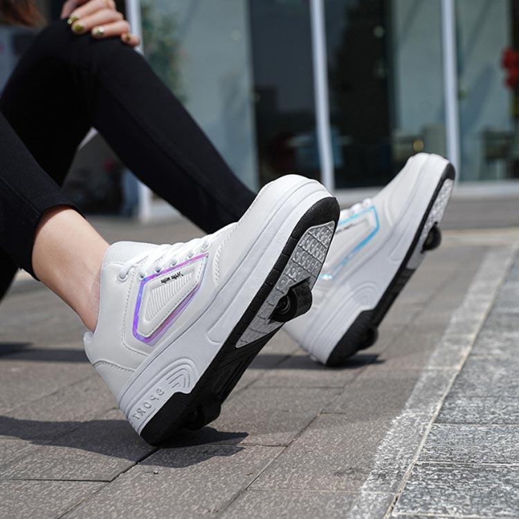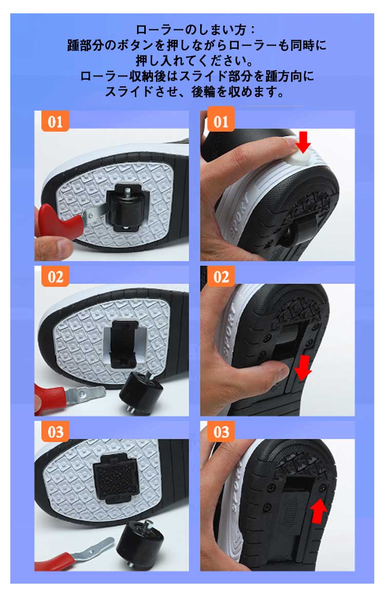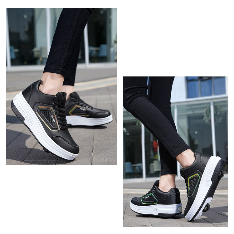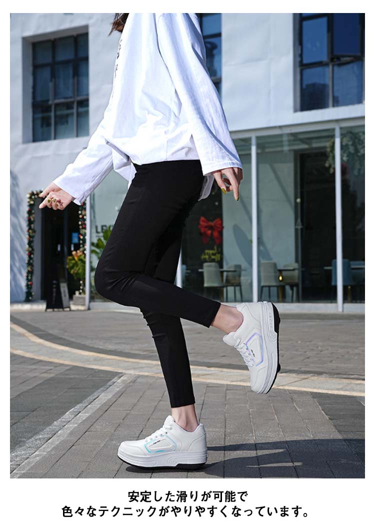 【二輪式ローラーシューズ】【22.0~26.0cm】【2color】これは、初心者やカジュアルなローラースケート選手のニーズを満たすことができる優れたエントリーレベルのローラースケートです。車輪をオフにすると、自由に歩いたり走ったりできます。強力な支持力、耐衝撃性、より安全で快適な滑走。優れた耐摩耗性と耐衝撃性、ノイズの低減、より快適でより良いスケート効果。安定した滑りが可能で色々なテクニックがやりやすくなっています。フロントのローラーは取り外しができるタイプで、付属の蓋をハメればスニーカーとしても使えます!ローラーのしまい方:踵部分のボタンを押しながらローラーも同時に押し入れてください。ローラー収納後はスライド部分を踵方向にスライドさせ、後輪を収めます。