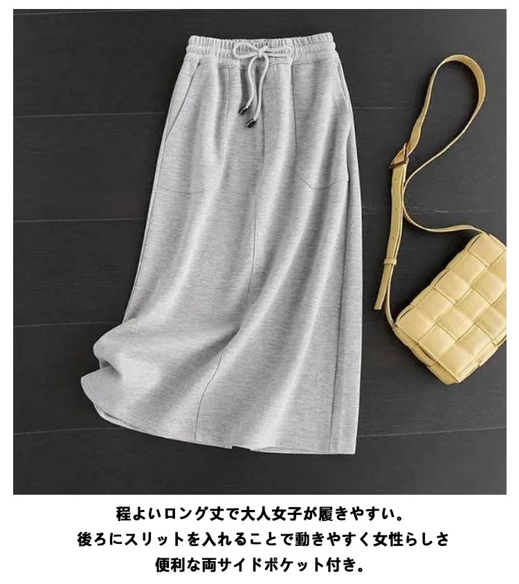 お洒落な大人女子必須。デイリーコーデに役立つスウェット ロングスカート。ほんのりきれいに広がるaラインシルエットで仕上げたこのスカート。曲線的なシルエットが体のラインを女性らしく見せてくれます。ずっと愛用したい心地良さ。程よい厚みのスウェットは、春から秋とロングシーズン活躍。程よいロング丈で大人女子が履きやすい。後ろにスリットを入れることで動きやすく女性らしさ◎便利な両サイドポケット付き。ウエストゴムで着脱もしやすく、ストレスフリーなはき心地。Tシャツやパーカーと合わせたカジュアルスタイルはもちろん、きれいめトップスやニットと合わせたフェミニンスタイルにも◎