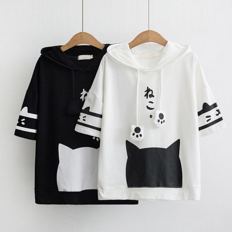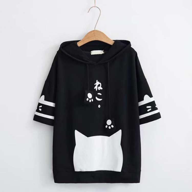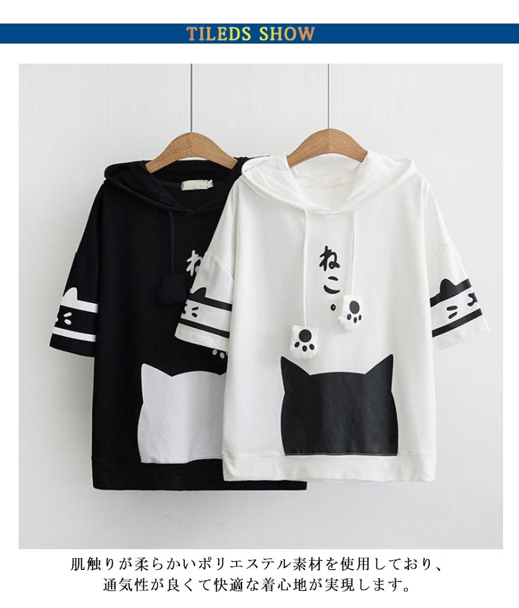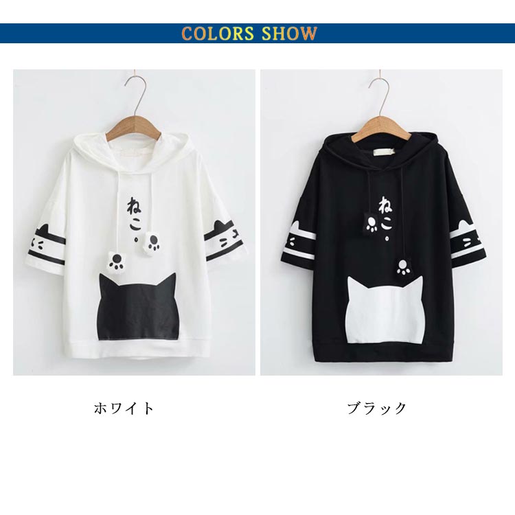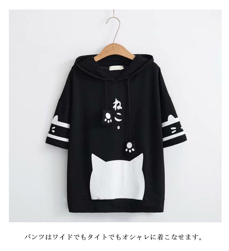 プルオーバー パーカー 大きいサイズ 春 夏 薄手 フード付き 猫耳付き 半袖 レディース メンズ 可愛い トップス 白 ねこ 猫柄 プルオーバー 夏服 ネコ ねこ 肉球 ルームウェア カジュアル おしゃれ パーカー ゆったり 体型カバー 黒 猫耳 ギフト 送料無料