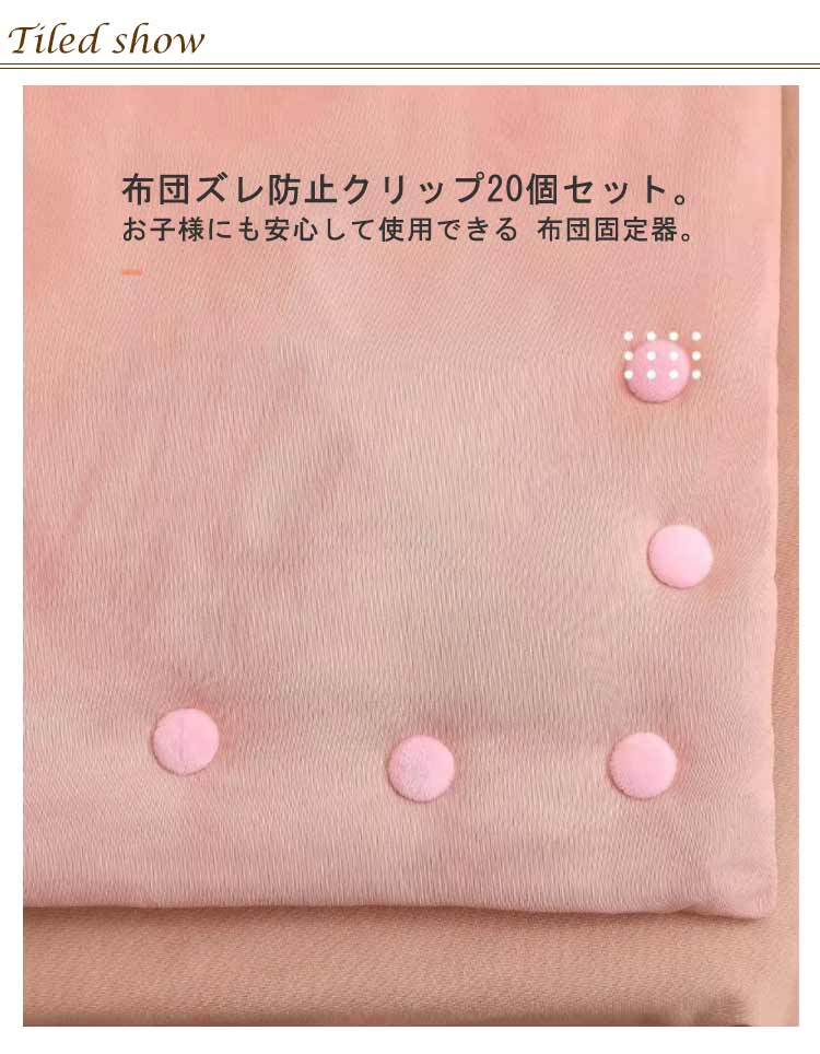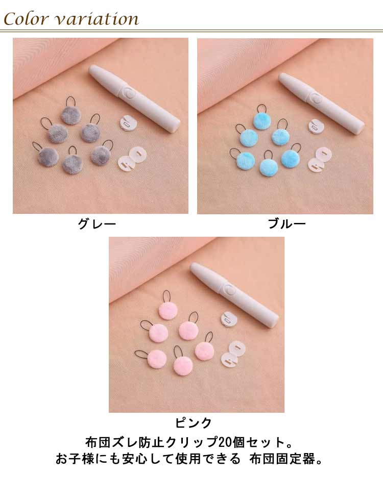 | 布団ズレ防止クリップ20個セット。お子様にも安心して使用できる 布団固定器。 コンパクトで首元や顔にあたらない? 針やピンを使わないから、安全性が高く、お子様や赤ちゃんがいるご家庭でも安心してお使いいただけます。 ひざ掛け毛布、ブランケット、カーテンの固定や靴下保管などにも使用でき、より実用的。 繰り返して使用できるからコスパうよく経済的。 | |