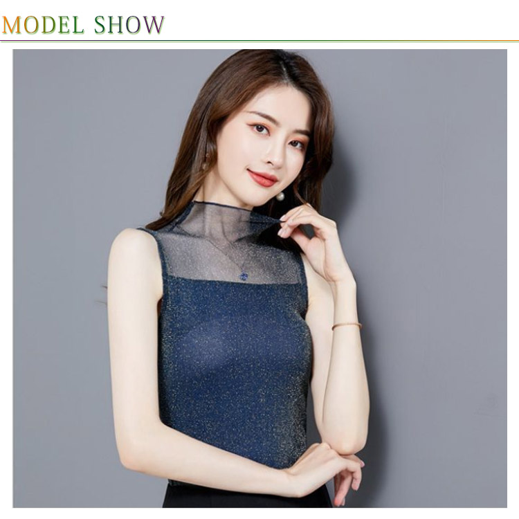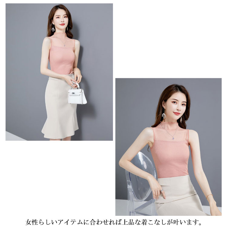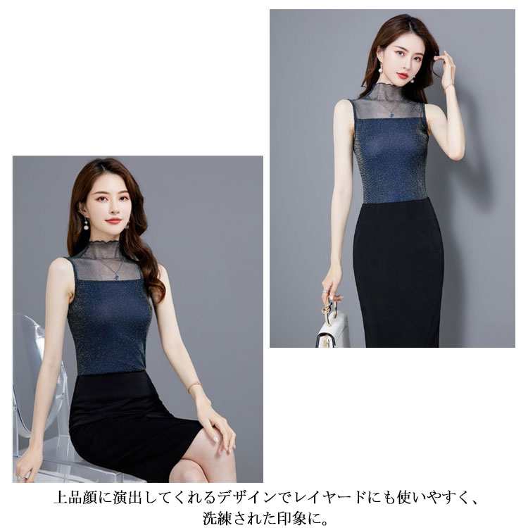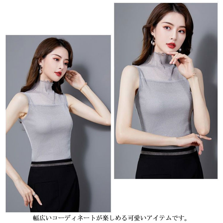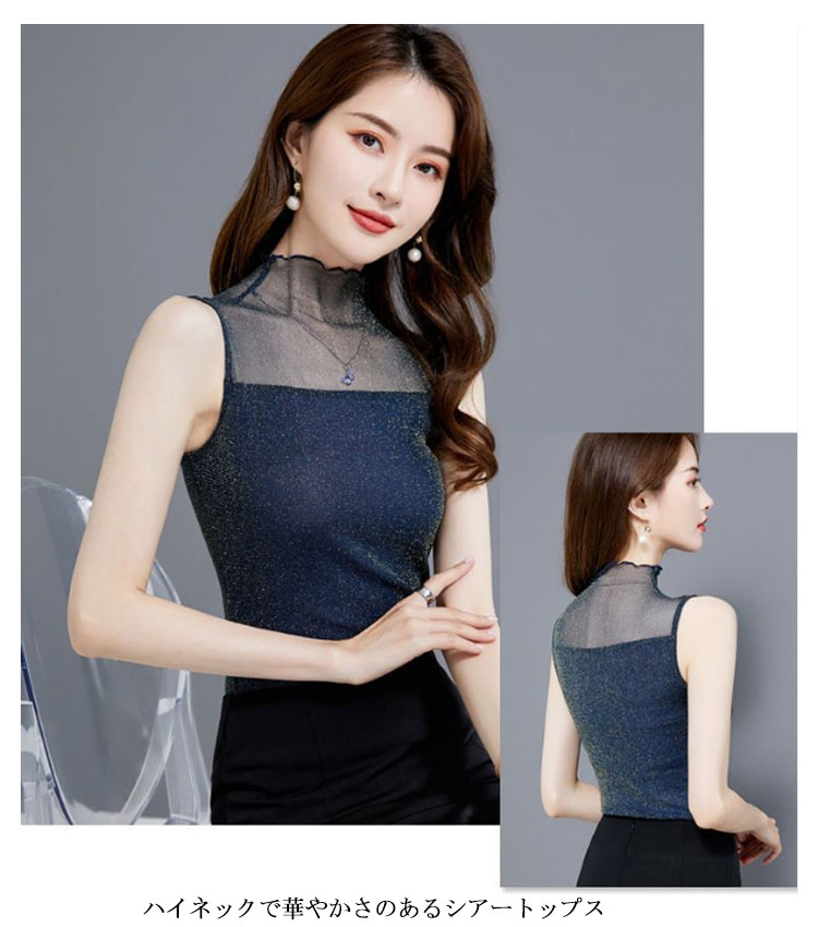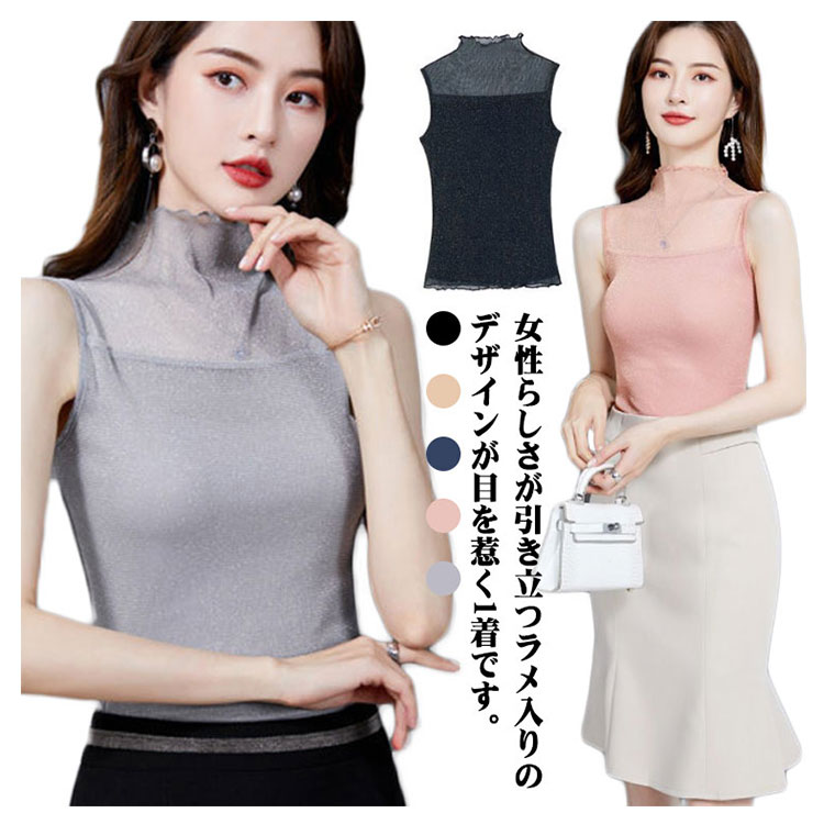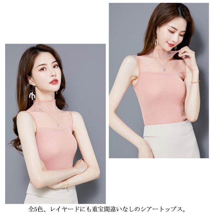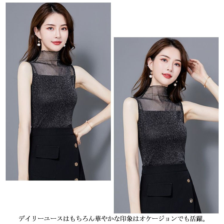 キラキラ シアー トップス インナー レディース ノースリーブ シースルー タンクトップ ハイネック タイト Tシャツ ラメ入り メッシュトップス おしゃれ かわいい 春 夏 S M L XL 2XL