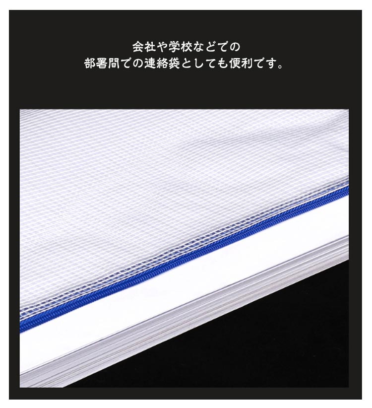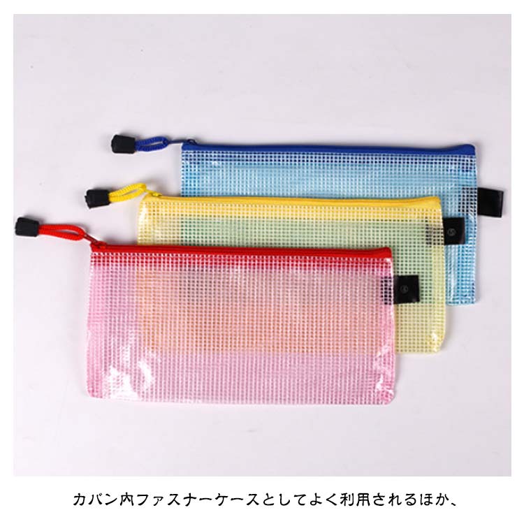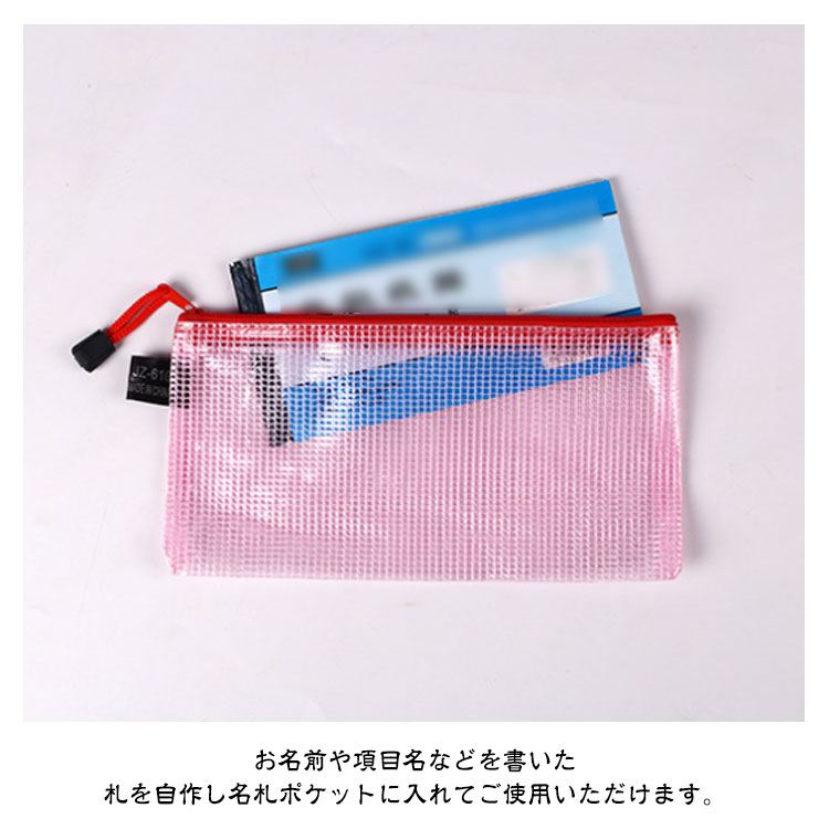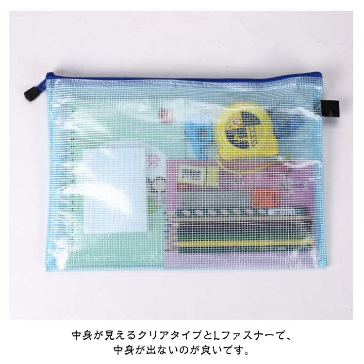 | 4個セット A3 A4 A5 A6 B4 B5 カバンの中の整理に役に立つファスナーケース。 中身が見えるクリアタイプとLファスナーで、中身が出ないのが良いです。 お名前や項目名などを書いた札を自作し名札ポケットに入れてご使用いただけます。 カバン内ファスナーケースとしてよく利用されるほか、 会社や学校などでの部署間での連絡袋としても便利です。 ファイルや書類、論文、雑誌、化粧品、領収書などの小物の保管に使用できます。 | |