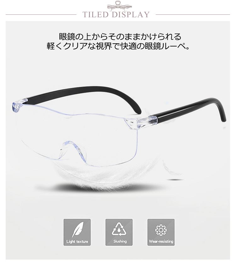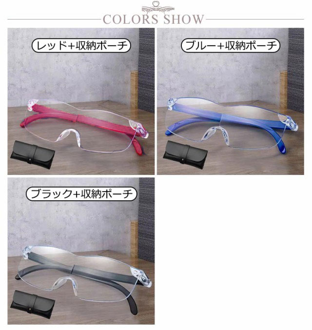 | 3COLORS 収納ポーチ付 眼鏡の上からそのままかけられる軽くクリアな視界で快適の眼鏡ルーペ 痛くなりにくい快適なノーズパットを採用、品質とコストにこだわった逸品 | |