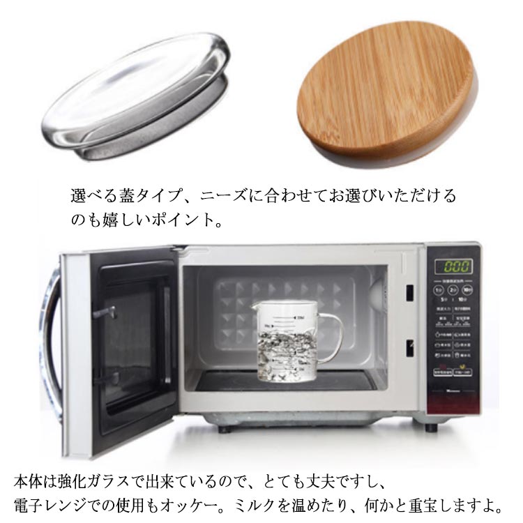 食洗機や電子レンジでもお使い頂けるガラス計量カップガラス製なので色や臭い移りが無く、いろいろと使いまわすことができて便利。注ぎ口が付いているので、液体を注ぐ時もこぼれにくいです。本体は強化ガラスで出来ているので、とても丈夫ですし、電子レンジでの使用もオッケー。ミルクを温めたり、何かと重宝しますよ。選べる蓋タイプ、ニーズに合わせてお選びいただけるのも嬉しいポイント。ガラス製なので中身が見えて調理の加減が一目でわかります。保存時も中身が見えるので便利です。