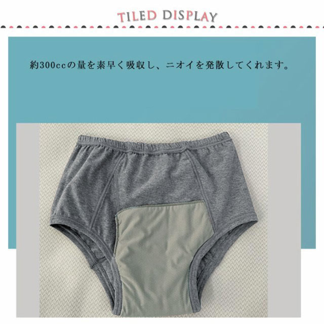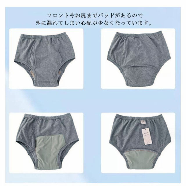 | 前開き失禁パンツ 【約300cc吸水量】 約300ccの量を素早く吸収し、ニオイを発散してくれます。 フロントやお尻までパッドがあるので外に漏れてしまい心配が少なくなっています。 ウエストゴム部分の伸びがよく、締め付けが少なく、着用も簡単です。 4層になっていて、肌に近い2層で吸水し、外側の2層は水を外に出さないように強力ブロックしています。 綿混素材で肌ざわりも抜群です。べたつかずいつでもサラサラでさわやか! さわやか吸収で安心して外出できます!臭わないから安心!ズレない、漏れない、消臭、抗菌。 何度でも洗濯できるので、経済的です。 普段使いにも、旅行などの出かけ先にも安心してお使いいただけます。 尿漏れパンツと気づかれないデザイン!おしゃれにも気を遣う、かっこいいお父さんに喜ばれます。 | |