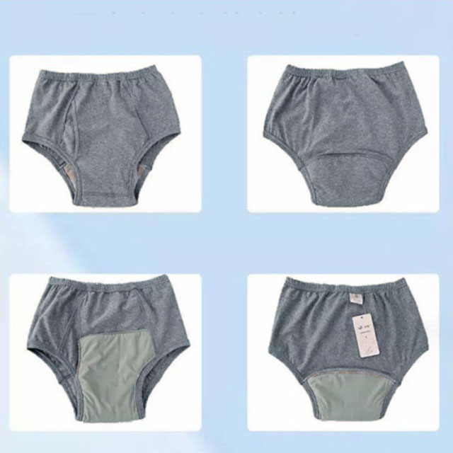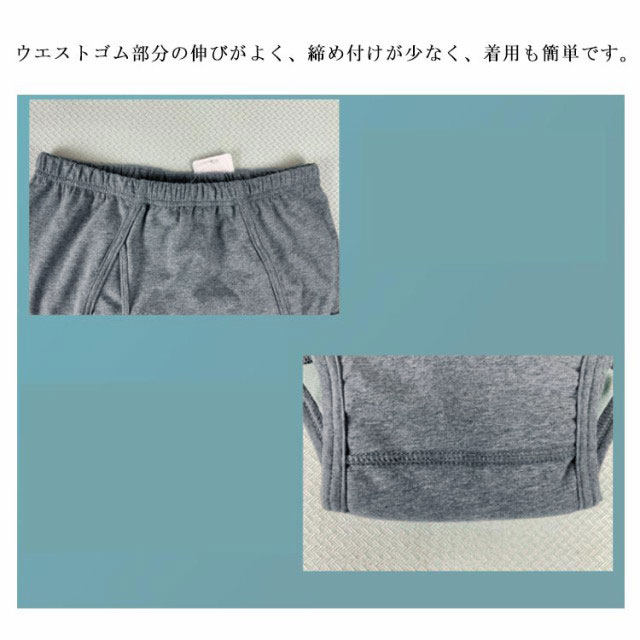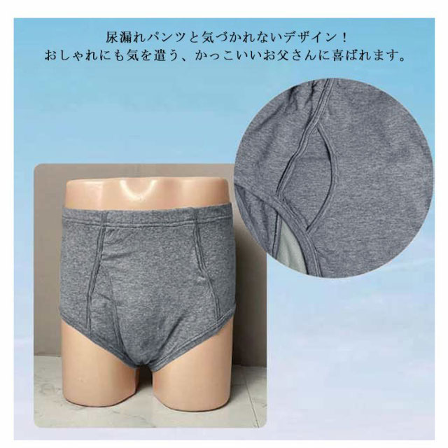 前開き失禁パンツ 【約300cc吸水量】約300ccの量を素早く吸収し、ニオイを発散してくれます。フロントやお尻までパッドがあるので外に漏れてしまい心配が少なくなっています。ウエストゴム部分の伸びがよく、締め付けが少なく、着用も簡単です。4層になっていて、肌に近い2層で吸水し、外側の2層は水を外に出さないように強力ブロックしています。綿混素材で肌ざわりも抜群です。べたつかずいつでもサラサラでさわやか!さわやか吸収で安心して外出できます!臭わないから安心!ズレない、漏れない、消臭、抗菌。何度でも洗濯できるので、経済的です。普段使いにも、旅行などの出かけ先にも安心してお使いいただけます。尿漏れパンツと気づかれないデザイン!おしゃれにも気を遣う、かっこいいお父さんに喜ばれます。