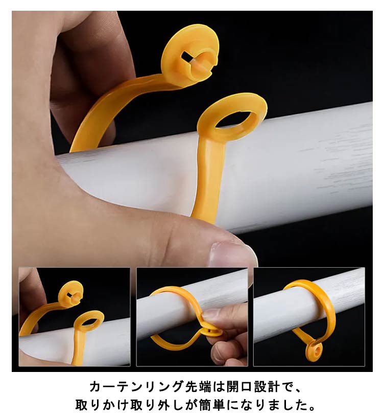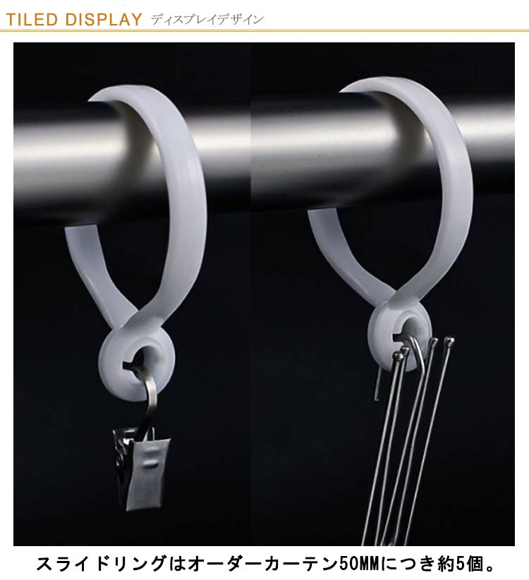 | スライドリングはオーダーカーテン50mmにつき約5個。 カーテンリング先端は開口設計で、取りかけ取り外しが簡単になりました。 直径50mmまでのポールに適用で、ご購入の際はお使いのポールなどのサイズもご確認下さい。 | |