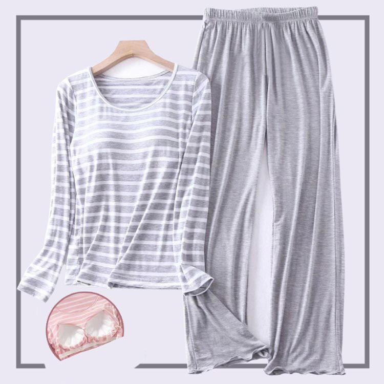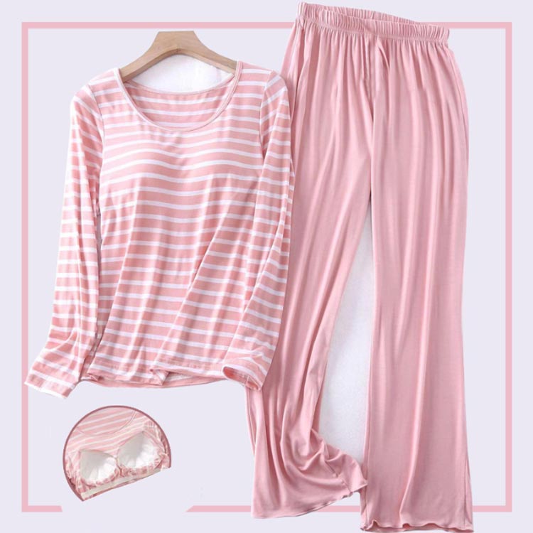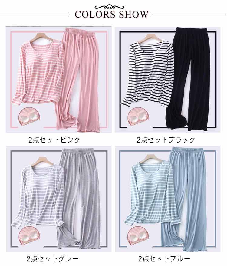 カップ付 肌が気持ちいい ルームウェア レディース 2点セット ボーダー 上下セット パジャマ 長袖 Uネック ナイトウェア 部屋着 寝巻き セットアップ パッド付き ブラ付き 送料無料