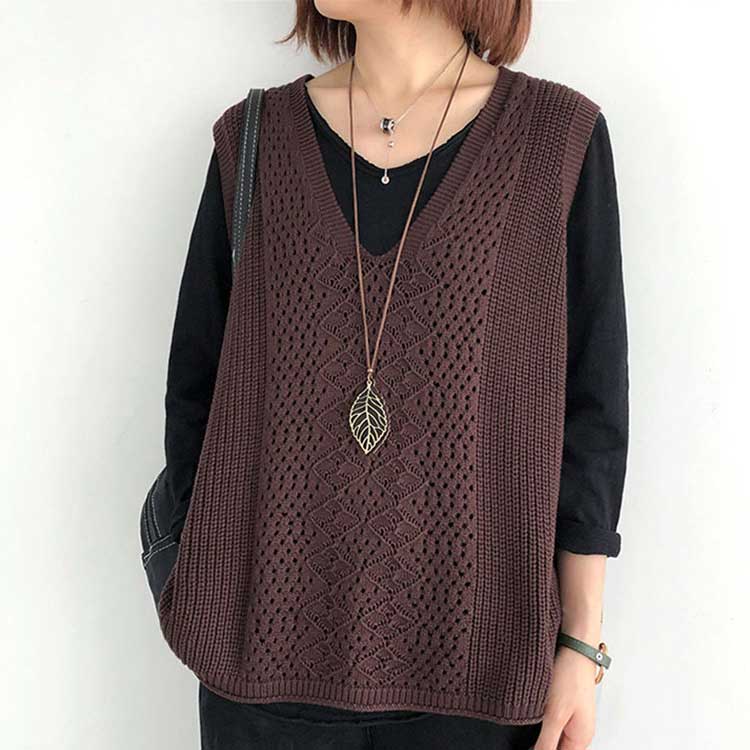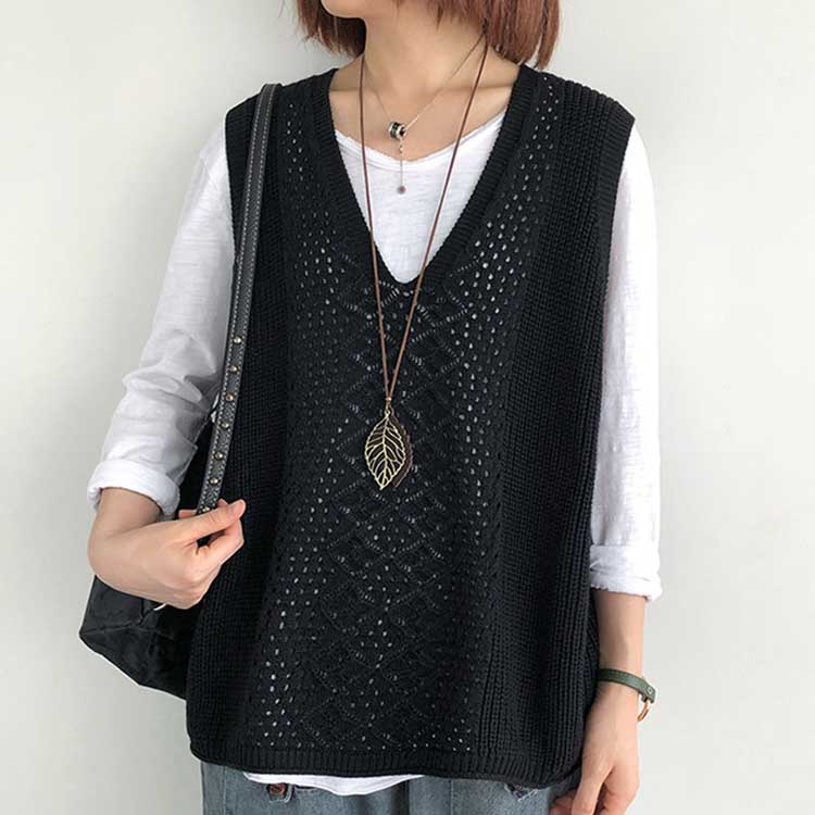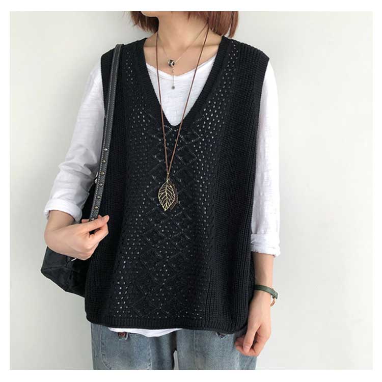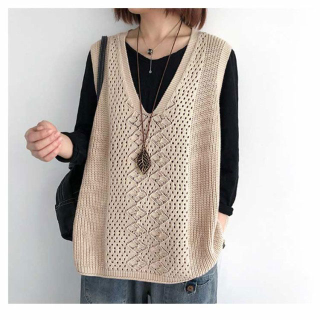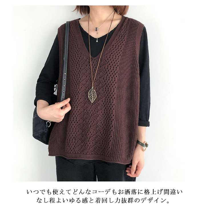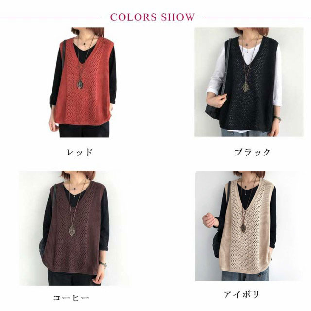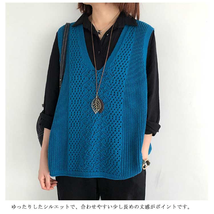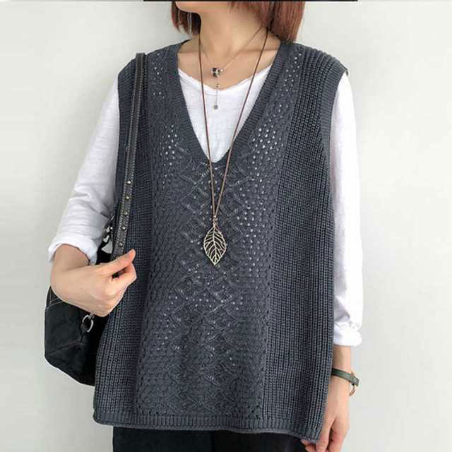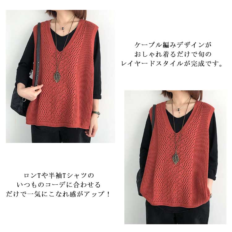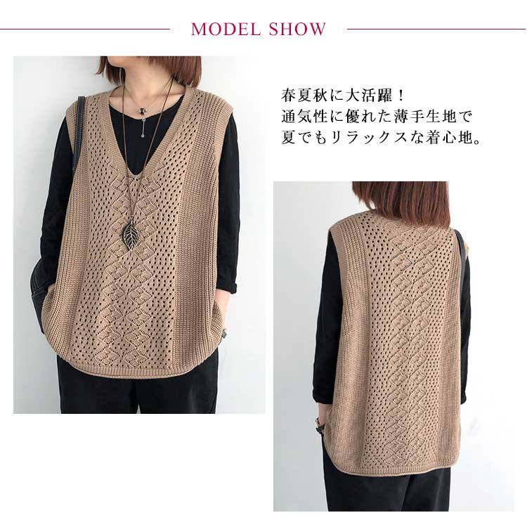 レディース ニットベスト Vネック ノースリーブ ベスト プルオーバー ケーブル編み 薄地 無地 ゆったり ミディアム丈 ストレッチ カジュアル レイヤード 重ね着 春 夏 秋 送料無料 カジュアル ニットタンクトップ レイヤード