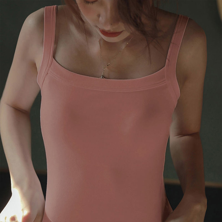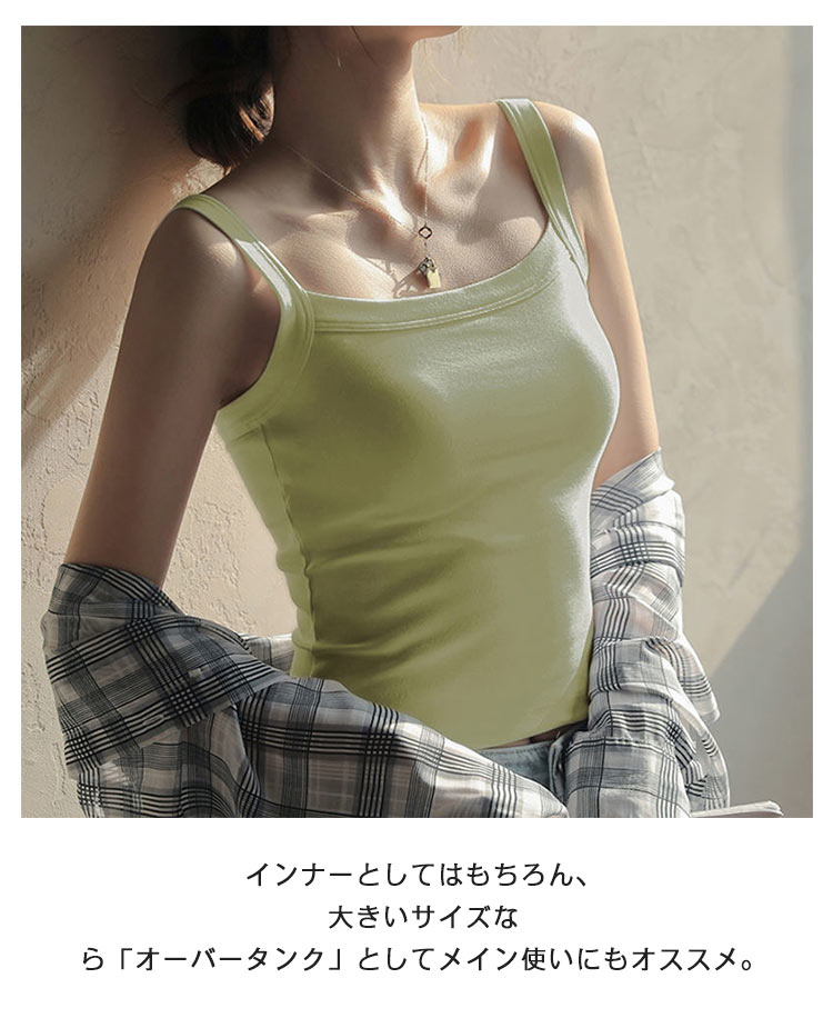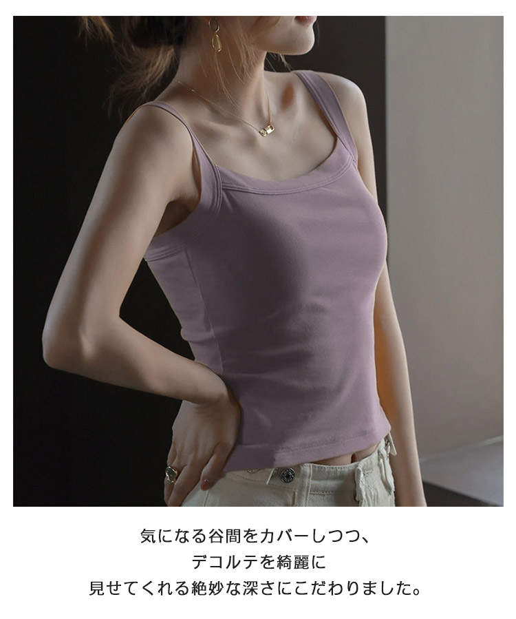 胸の谷間をカバー・チラ見せ防止のカップ付きキャミソール。綿混の優しい肌当たりで生地に透け感はありません。ワイヤーレスなのに、二重構造でバストをしっかり支える作りになっています。前後スクエアネックになっているので、バストだけでなく後ろ姿も美しく見せることができます。気になる谷間をカバーしつつ、デコルテを綺麗に見せてくれる絶妙な深さにこだわりました。スタイリッシュなデザインとフィット感はそのままに、より柔らかで軽い着け心地が特徴です。インナーとしてはもちろん、大きいサイズなら「オーバータンク」としてメイン使いにもオススメ。
