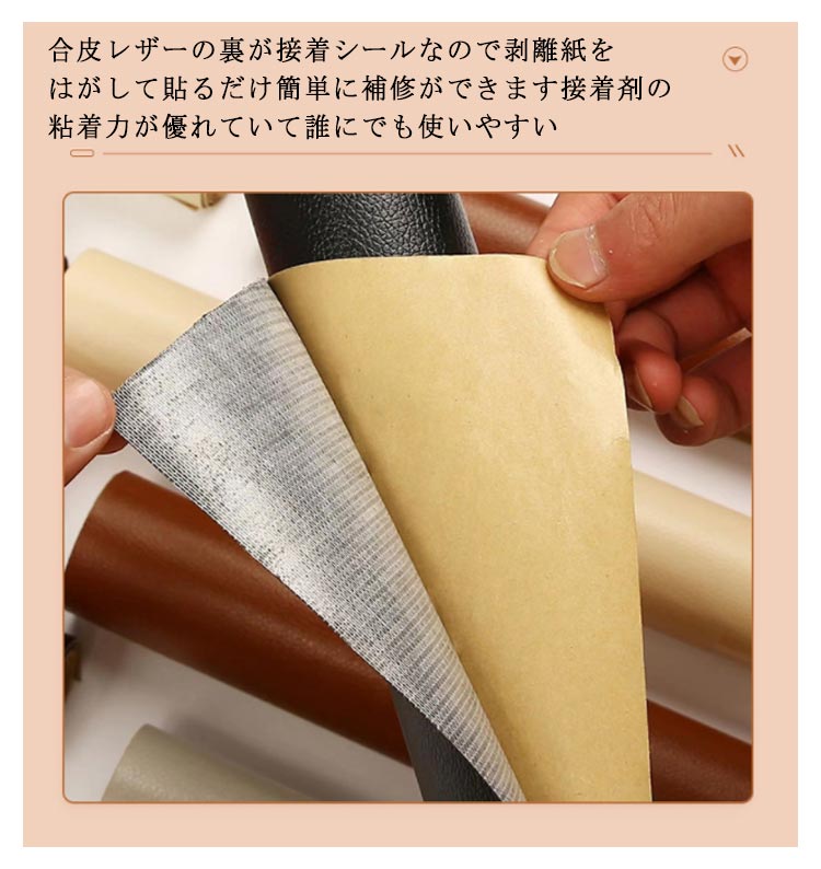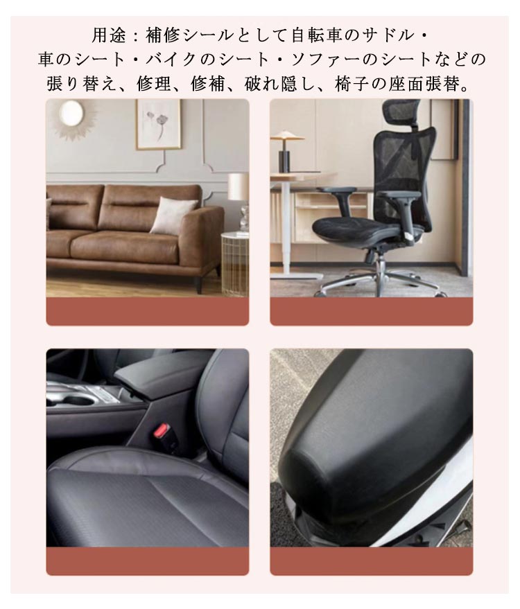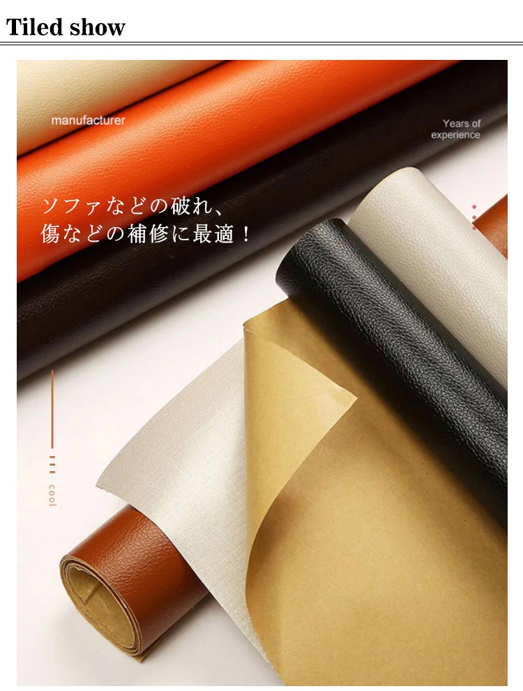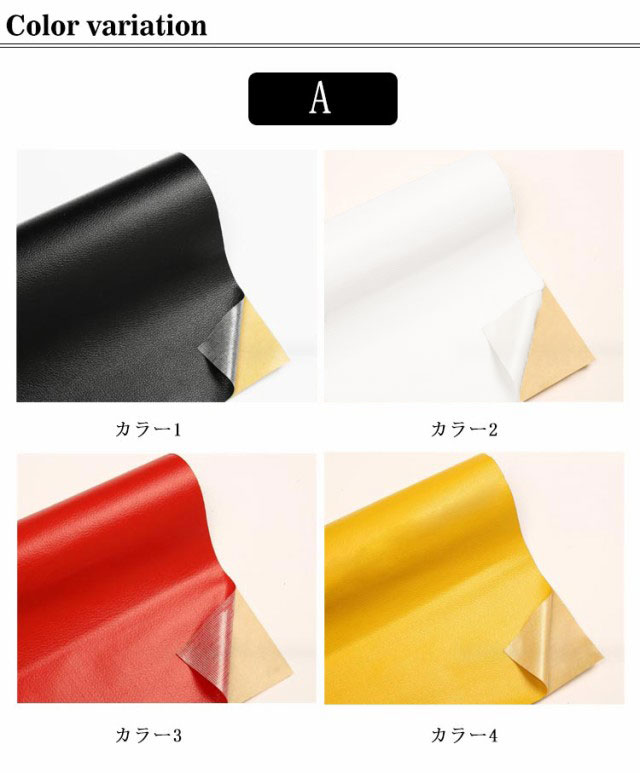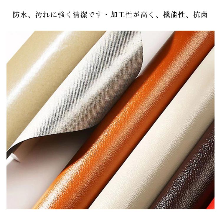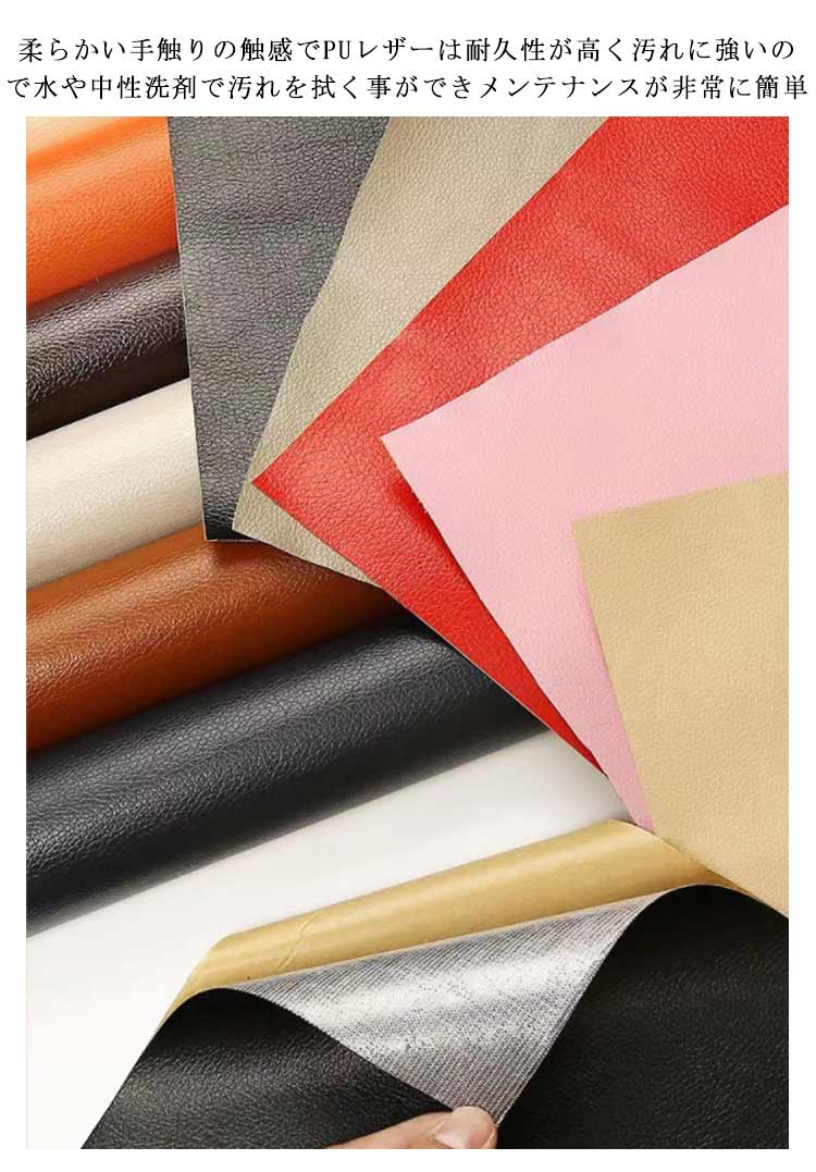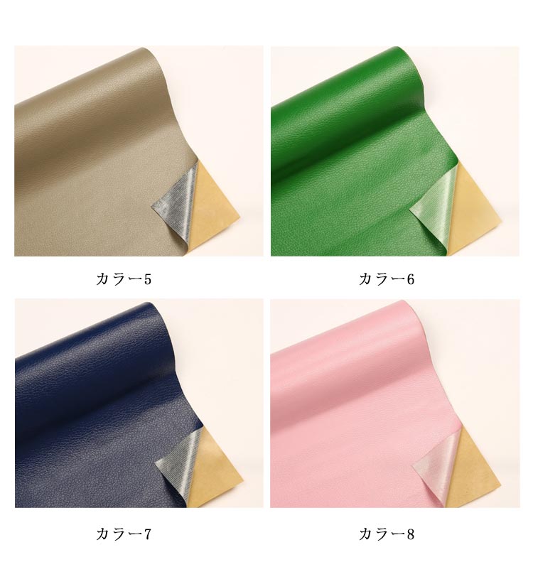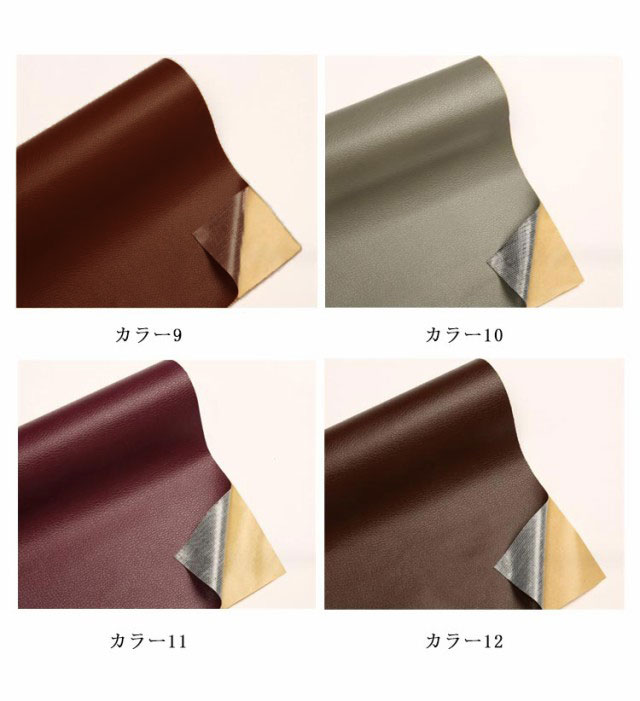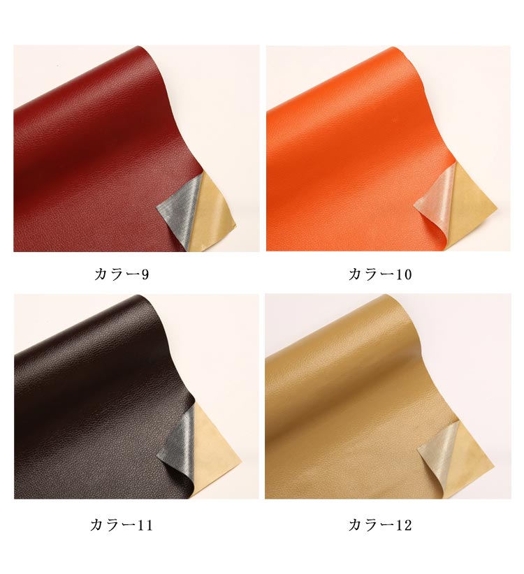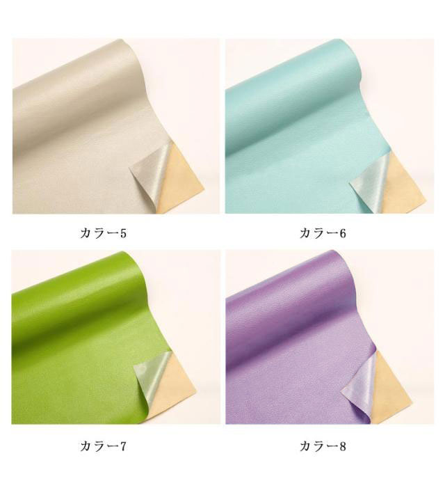 全24色!100×137cm厚さ1.0mmソファなどの破れ、傷などの補修に最適!合皮レザーの裏が接着シールなので剥離紙をはがして貼るだけ簡単に補修ができます接着剤の粘着力が優れていて誰にでも使いやすい柔らかい手触りの触感でPUレザーは耐久性が高く汚れに強いので水や中性洗剤で汚れを拭く事ができメンテナンスが非常に簡単防水、汚れに強く清潔です・加工性が高く、機能性、抗菌用途:補修シールとして自転車のサドル・車のシート・バイクのシート・ソファーのシートなどの張り替え、修理、修補、破れ隠し、椅子の座面張替。