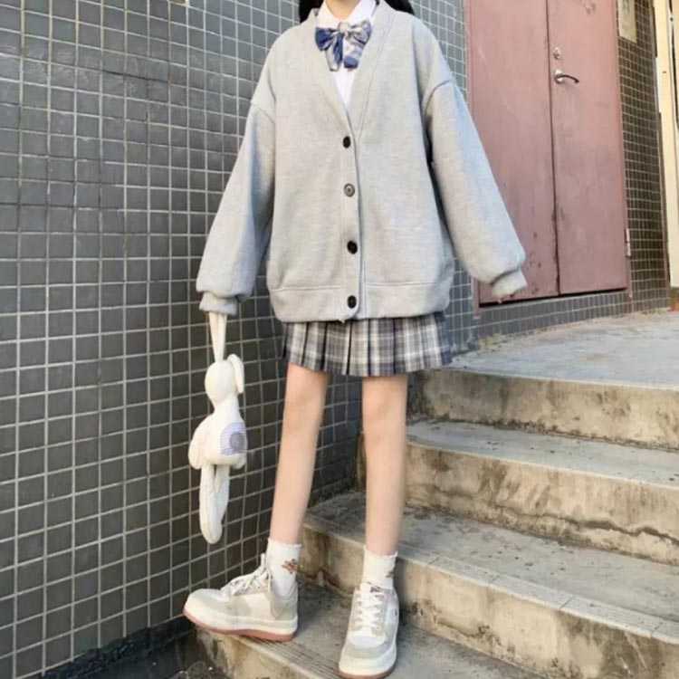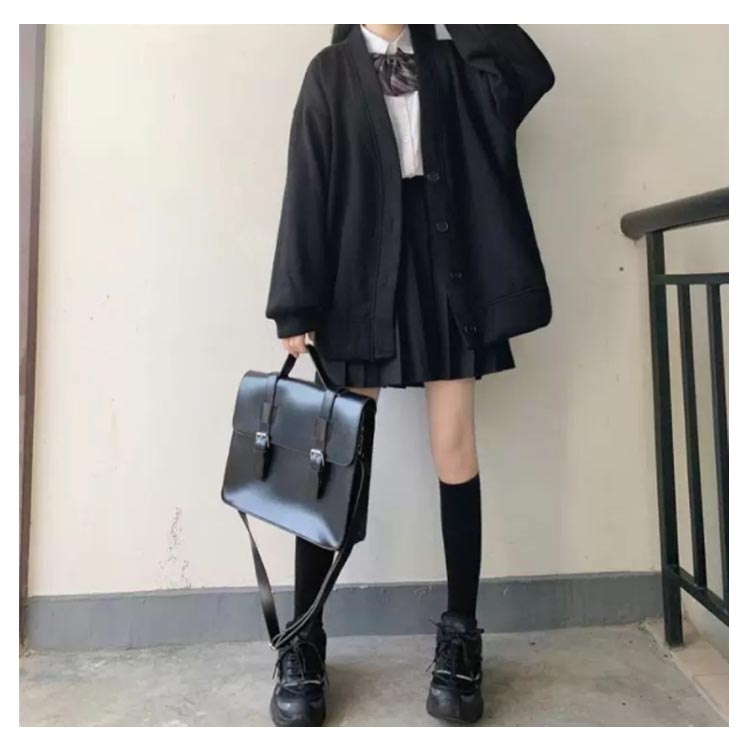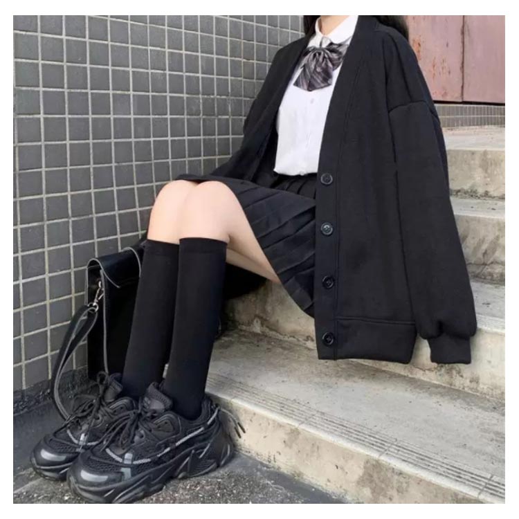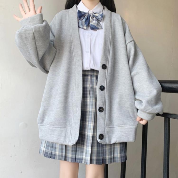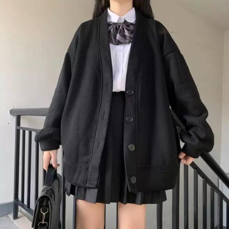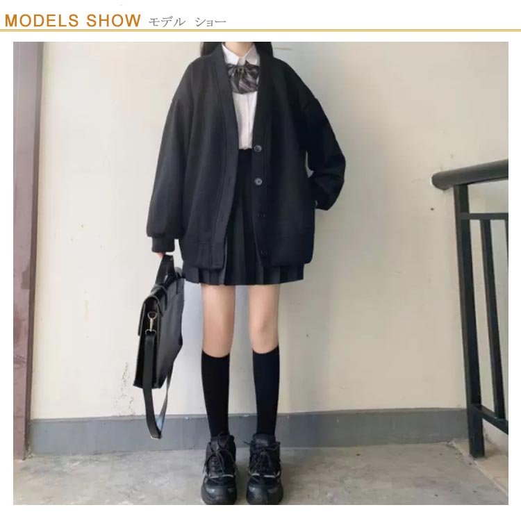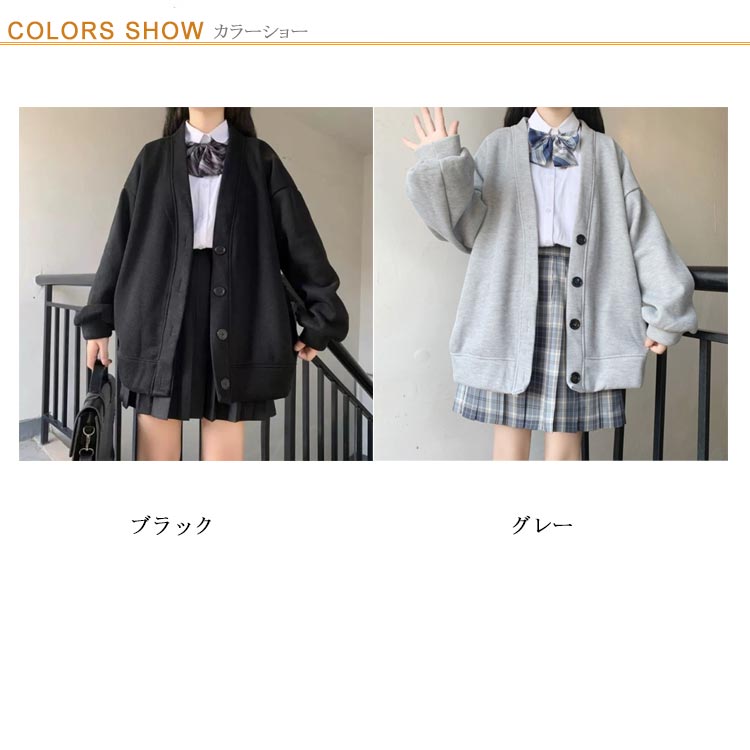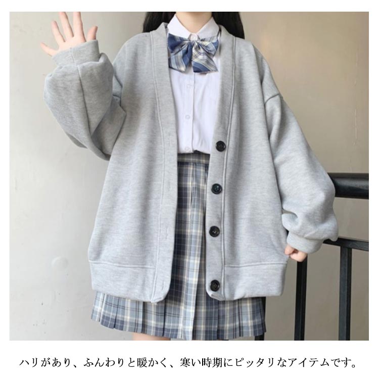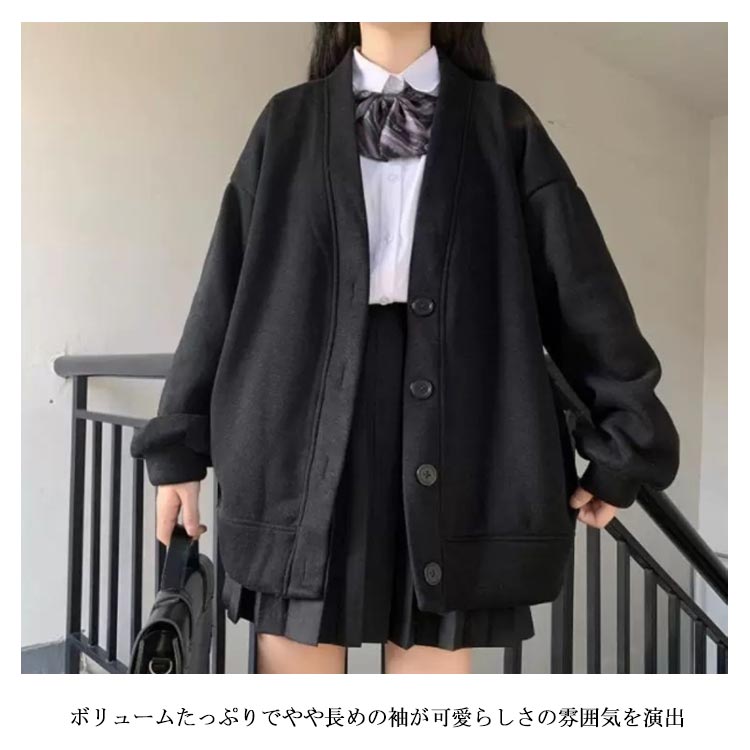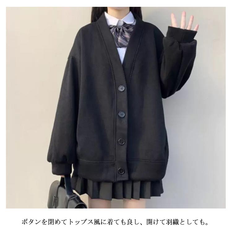 スクールカーディガン Vネック スウェット生地 薄手と裏起毛2タイプ ボリューム袖 レディース 女子 スウェットカーディガン 羽織り ボタン 制服 アウター 学生服 秋 冬 春 中学生 高校生 無地 かわいい オーバーサイズ 黒【送料無料】