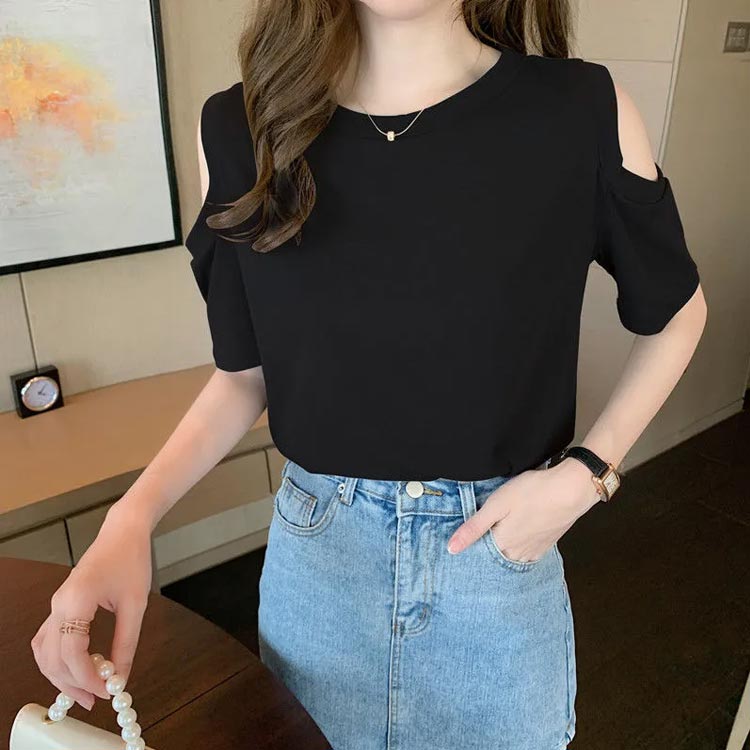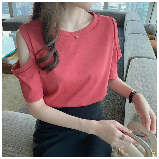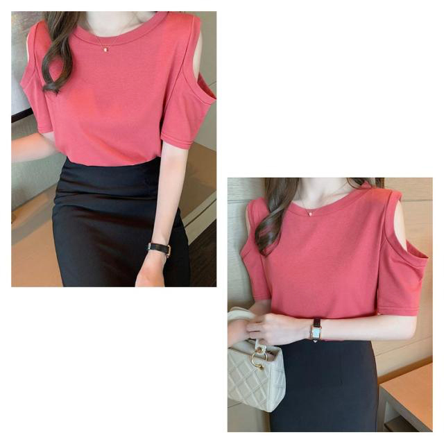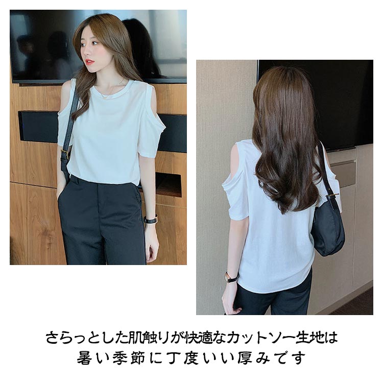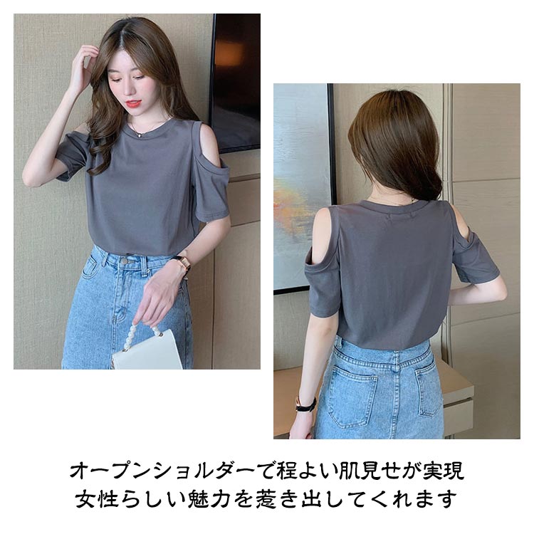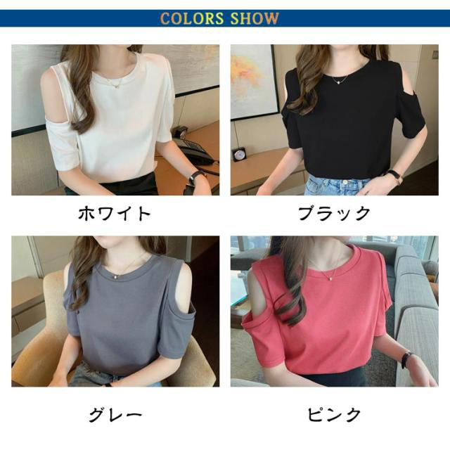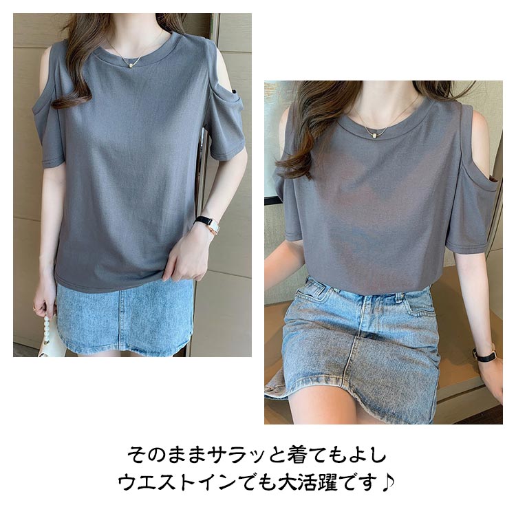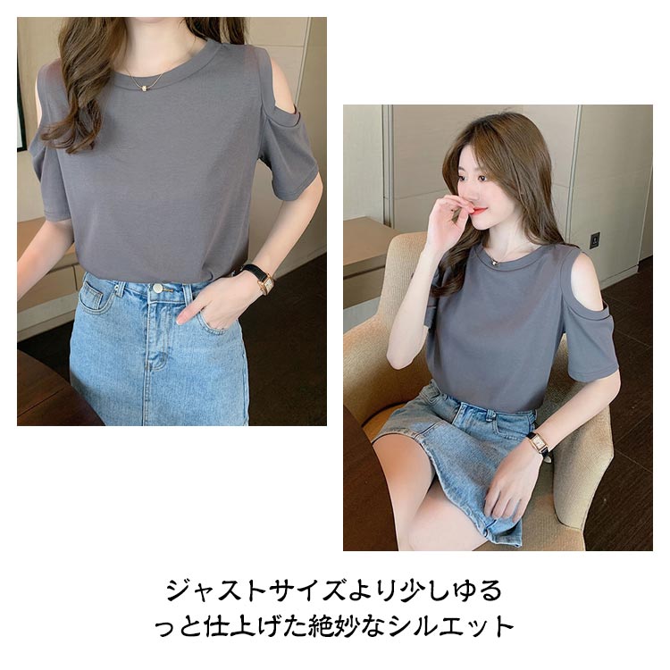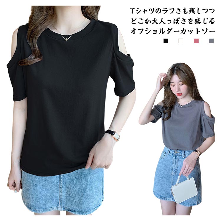送料無料 オフショルダー カットソー Tシャツ レディース 半袖 オフショル 半袖Tシャツ トップス 肩出し 肩あき 肌見せ クルーネック 夏 無地 ゆったり ビッグTシャツ ブラック ホワイト グレー ピンク