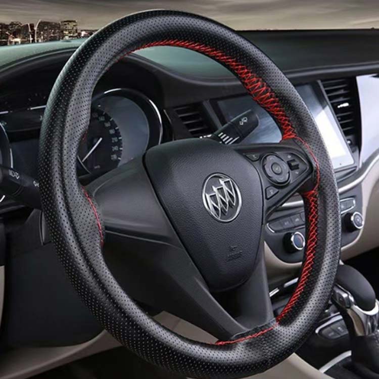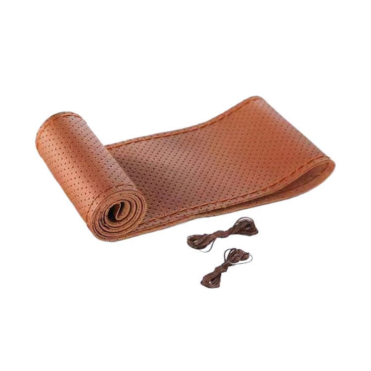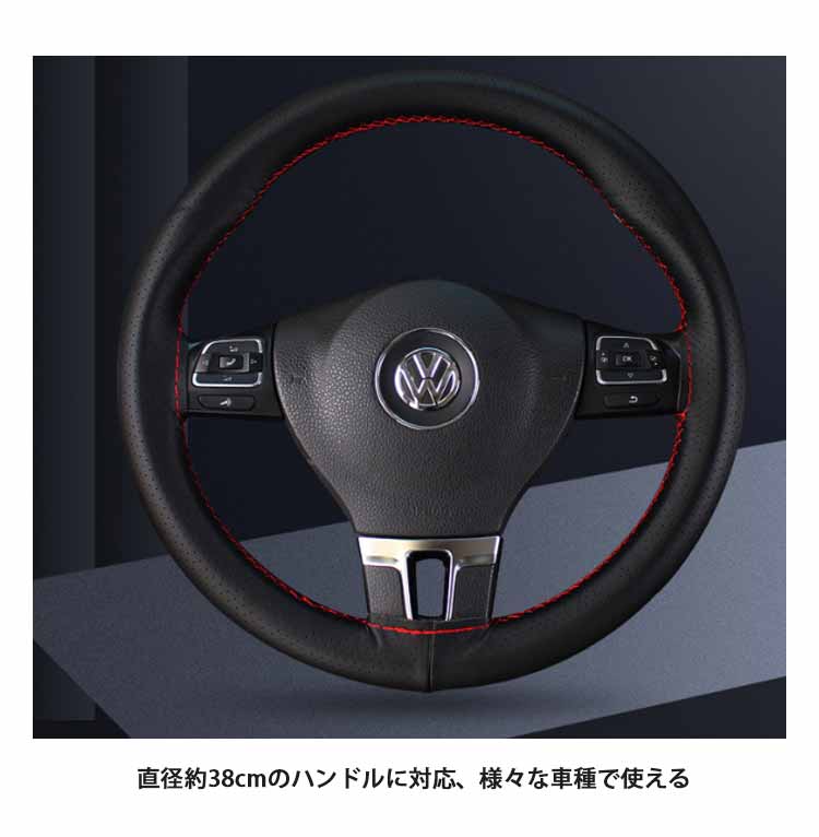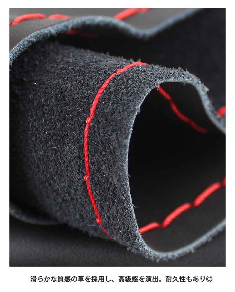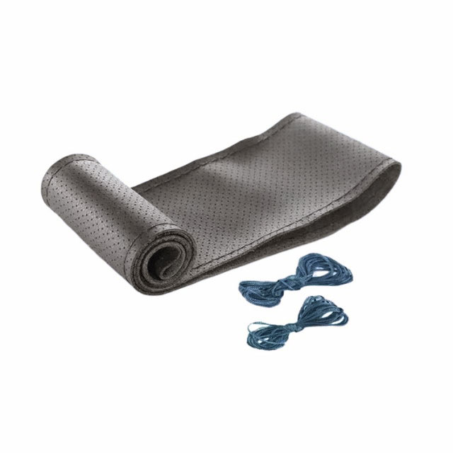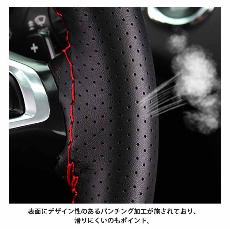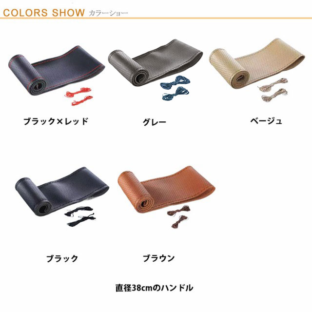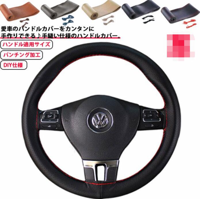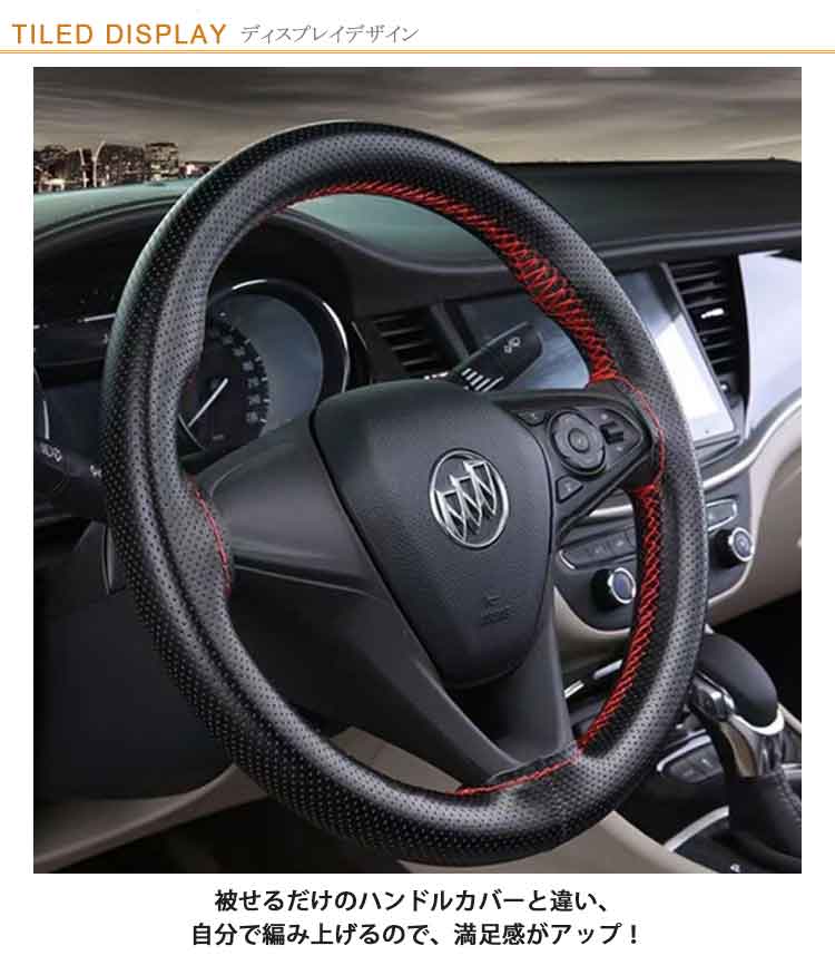 愛車のハンドルカバーをカンタンに手作りできる♪手縫い仕様のハンドルカバー。【DIY仕様】被せるだけのハンドルカバーと違い、自分で編み上げるので、満足感がアップ!カバー生地のステッチに糸を通し、ハンドルサイズに合わせて編み上げることで、しっかりフィット。【革】滑らかな質感の革を採用し、高級感を演出。耐久性もあり◎【パンチング加工】表面にデザイン性のあるパンチング加工が施されており、滑りにくいのもポイント。【ハンドル適用サイズ】直径約38cmのハンドルに対応、様々な車種で使える◎縫製の方法:最初にステアリングにカバーを均一 にかぶせ、びったりにフィットするように調整してください。縫い始めの糸は内側のステッチに結び固定してください。この結び目は ほどけないようにしっかり固定して ください。次に反対側の表面に有るステッチに糸を通し、合わせ目を絞めてください。同様に一回通す毎に絞めてください。順番に絞めていき、もし両側のステッチにズレが生じた場合、適度にステッチを一個飛んだり一針増やしたりして調整してください。ステッチを一個飛ばして縫っても結構です。この縫い方の方が早いです。 縫いながら手で調整してください。ひとつ飛ばしの縫製は時間と糸を 節約でき、同様の効果が有ります。