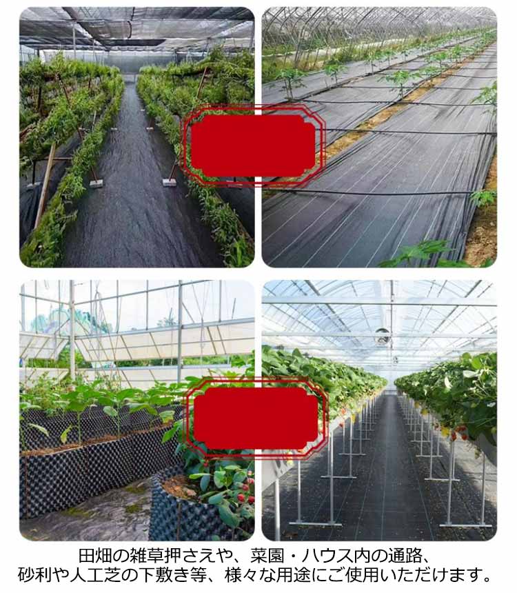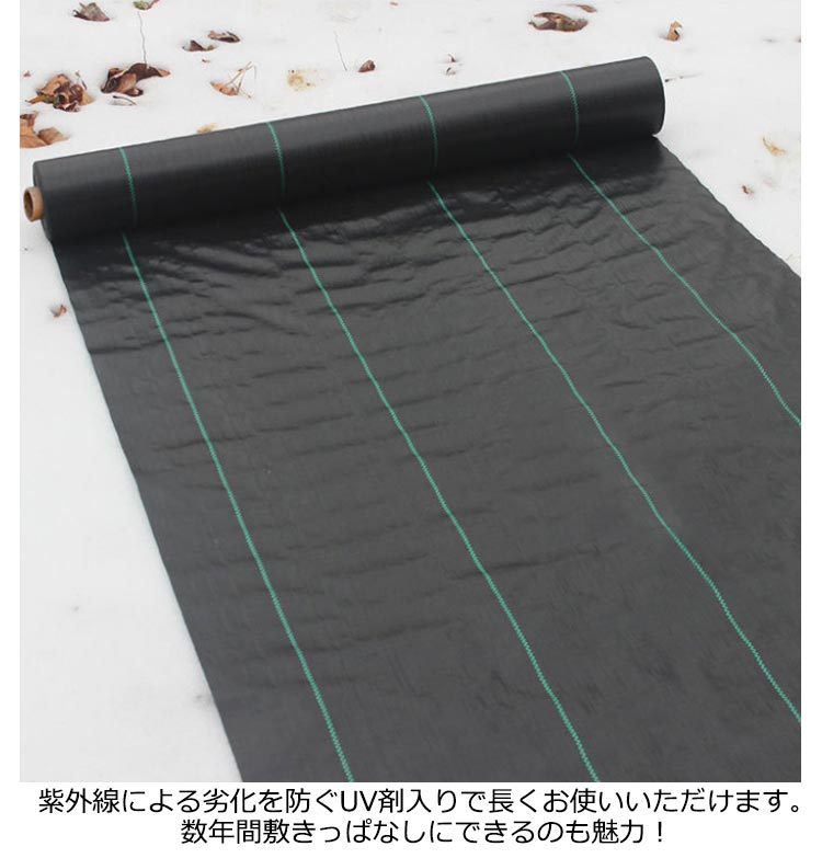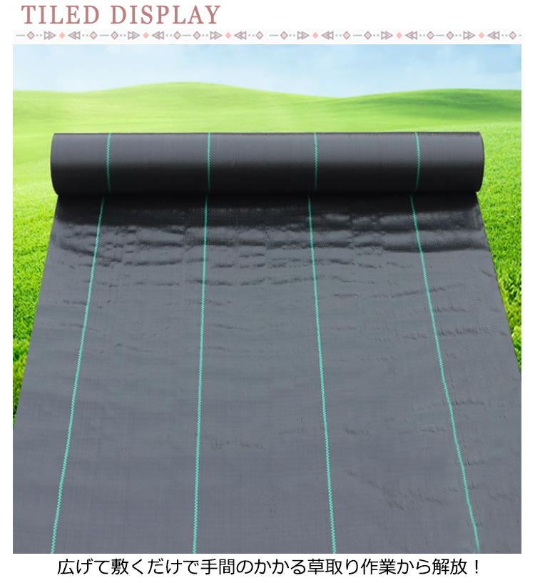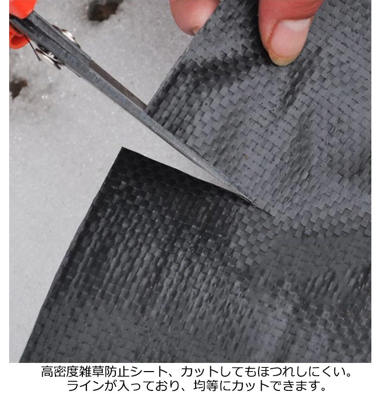 | 高密度?高透水性?耐用年数約7-12年 防草シート【長さ200m×幅0.5m】 広げて敷くだけで手間のかかる草取り作業から解放! 日光を遮断し雑草の光合成を抑える事で、何度抜いても生えてくる雑草を枯れさせて再発生を防ぐことができる防草シート。薬を使わないから、土を汚さず、人体や環境にも影響もありません。 紫外線による劣化を防ぐUV剤入りで長くお使いいただけます。数年間敷きっぱなしにできるのも魅力! 高密度雑草防止シート、カットしてもほつれしにくい。ラインが入っており、均等にカットできます。 田畑の雑草押さえや、菜園?ハウス内の通路、砂利や人工芝の下敷き等、様々な用途にご使用いただけます。 | |