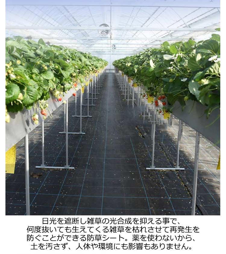 高密度・高透水性・耐用年数約7-12年防草シート【長さ200m×幅0.5m】広げて敷くだけで手間のかかる草取り作業から解放!日光を遮断し雑草の光合成を抑える事で、何度抜いても生えてくる雑草を枯れさせて再発生を防ぐことができる防草シート。薬を使わないから、土を汚さず、人体や環境にも影響もありません。紫外線による劣化を防ぐUV剤入りで長くお使いいただけます。数年間敷きっぱなしにできるのも魅力!高密度雑草防止シート、カットしてもほつれしにくい。ラインが入っており、均等にカットできます。田畑の雑草押さえや、菜園・ハウス内の通路、砂利や人工芝の下敷き等、様々な用途にご使用いただけます。