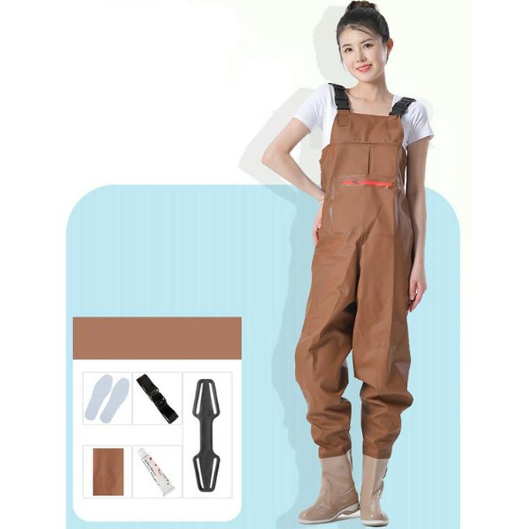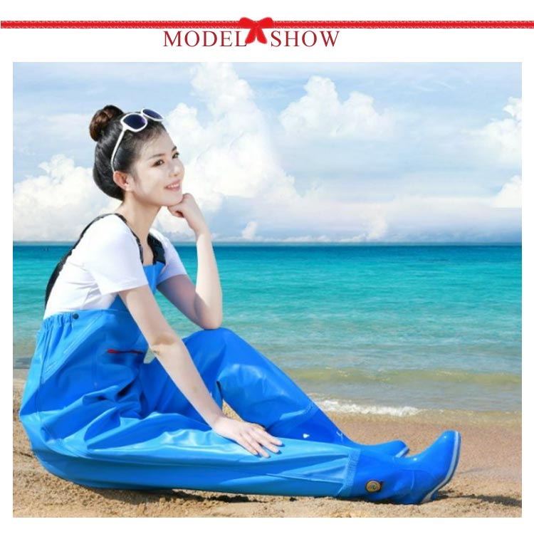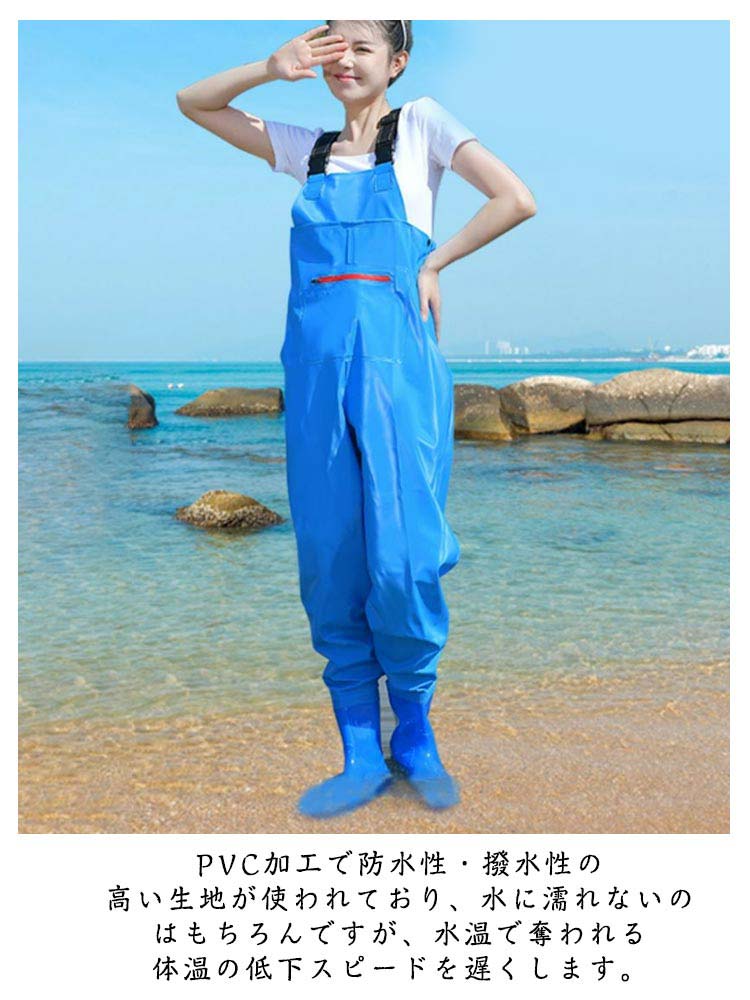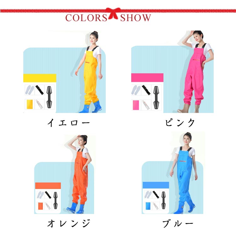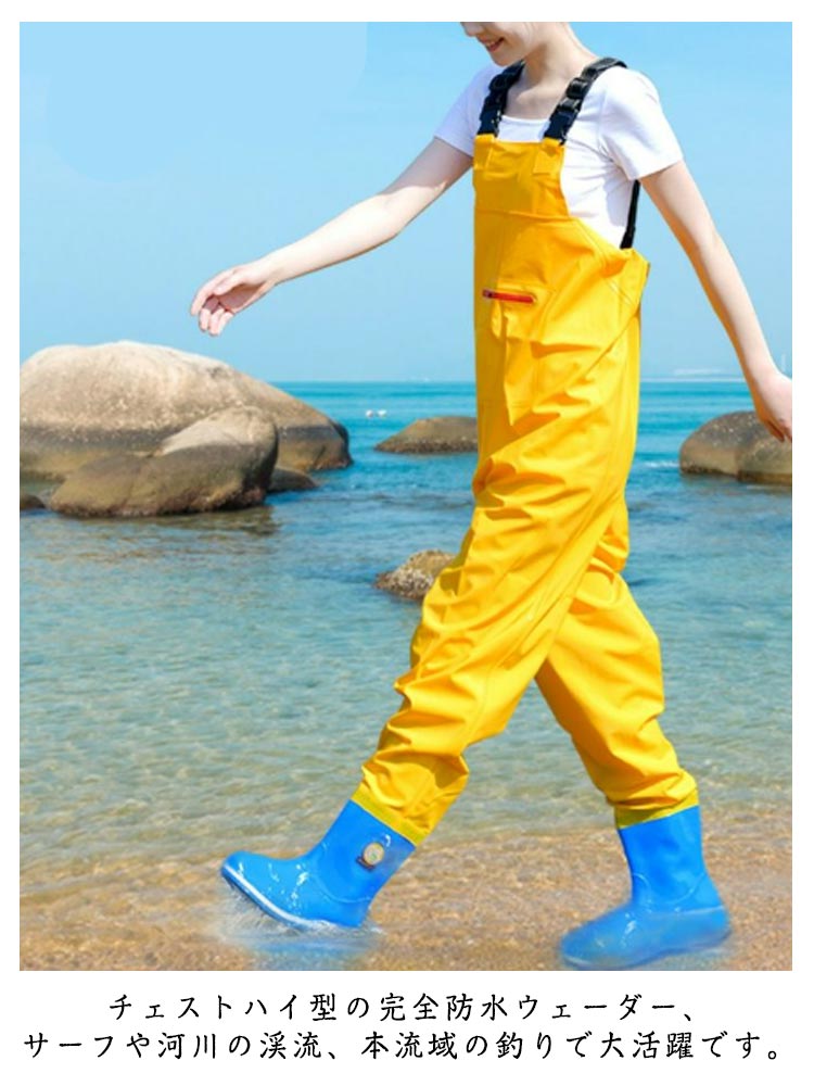 【23-25cm】【7colors】【チェストハイウェーダー】チェストハイ型の完全防水ウェーダー、サーフや河川の渓流、本流域の釣りで大活躍です。PVC加工で防水性・撥水性の高い生地が使われており、水に濡れないのはもちろんですが、水温で奪われる体温の低下スピードを遅くします。足から胸までを覆う部分に防水性・撥水性の高い生地が使われており、履くだけで体が濡れるのをしっかり防ぐことができます。ブーツとズボンは縫い合わせるのではなく、一体化でつくられており、水漏れはしません。通気性もよいこの胴長ウェーダーをはき、渓流に入っても体を乾燥的に保ちます。防滑ソールを採用しており、バス釣りや防波堤には最適です。靴裏は厚底になっており踏みつけ怪我の防止になります。様々な場所で活躍:川釣り、潮干狩り、水産加工場、魚市場での現場作業着に、また、田植えや草刈りなど農作業や雪掻き。海に川に湖に!釣りをするなら必須アイテム!便利なポケット付き。