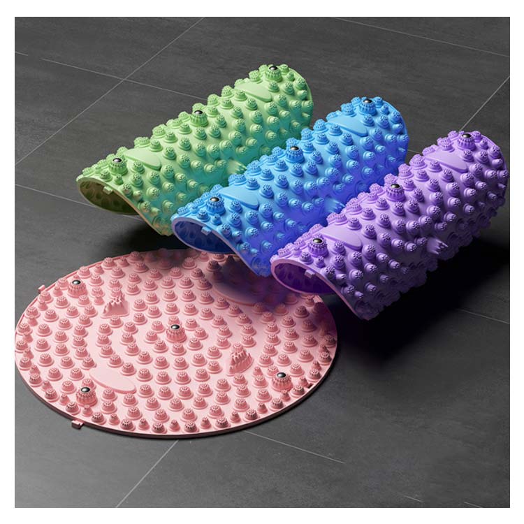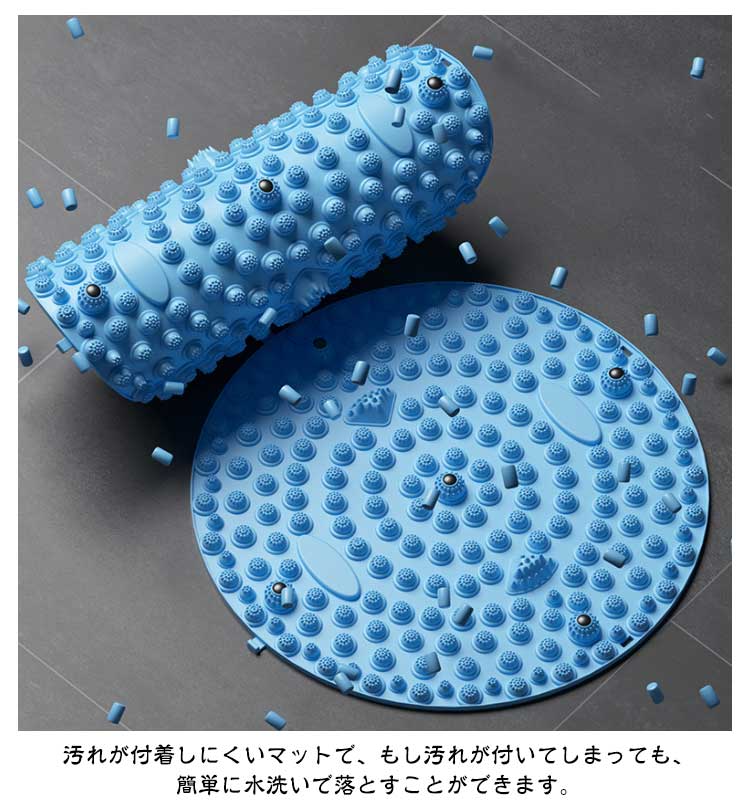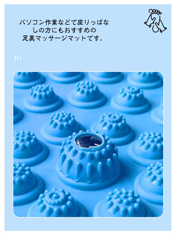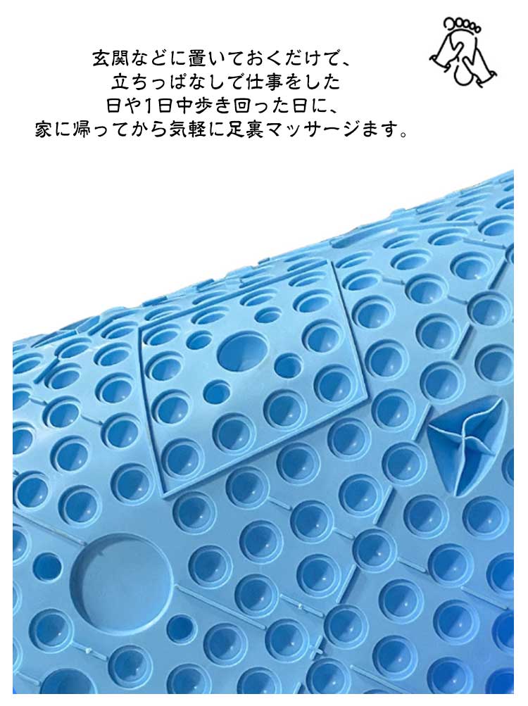 健康は足の裏から!日々の疲れを癒す足ツボマットです。踏むだけで足の裏の反射区を刺激することで、新陳代謝と血液循環を促進します。柔らかいTPE製のマットなので、ツボ押し部分が変形してしまう心配もございません。玄関などに置いておくだけで、立ちっぱなしで仕事をした日や1日中歩き回った日に、家に帰ってから気軽に足裏マッサージます。パソコンデスクやテーブルの下に、この足ツボ押しマッサージマットを置いて、座りながら気軽に足ツボマッサージをすることもできます。パソコン作業などで座りっぱなしの方にもおすすめの足裏マッサージマットです。汚れが付着しにくいマットで、もし汚れが付いてしまっても、簡単に水洗いで落とすことができます。