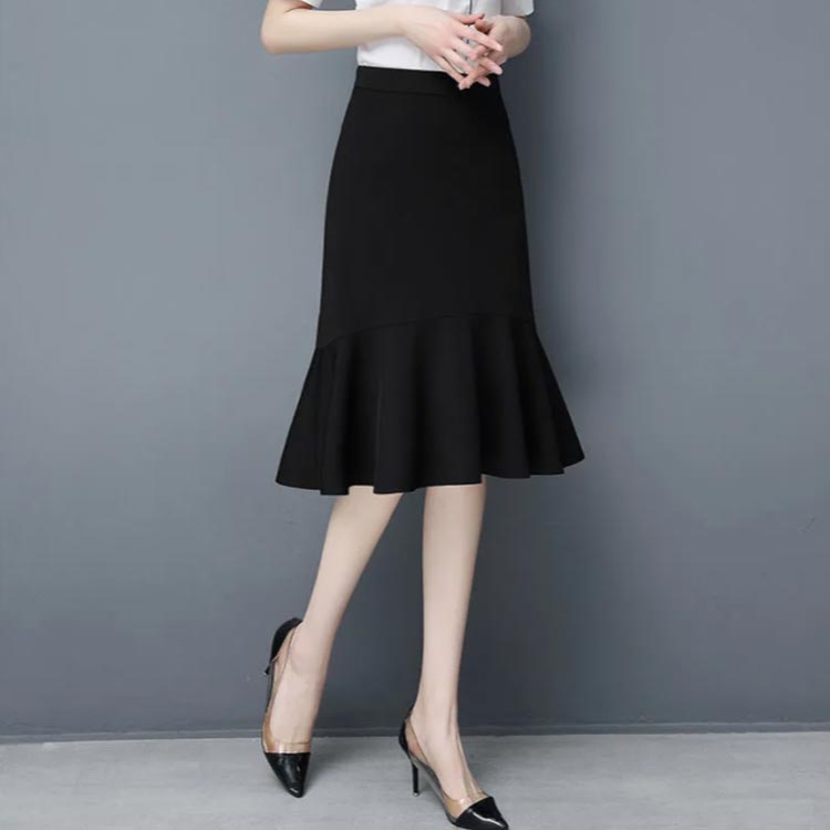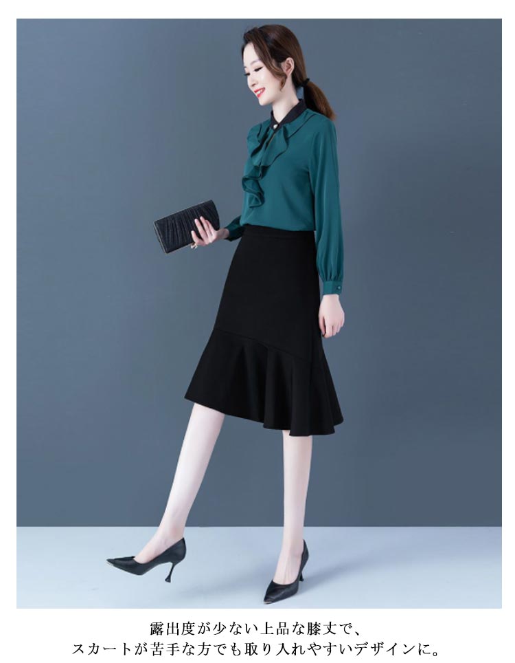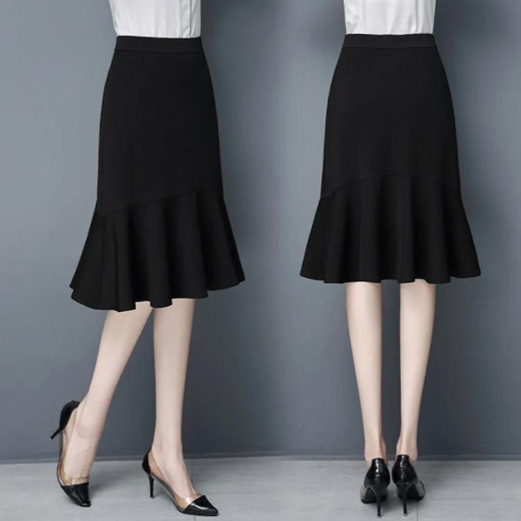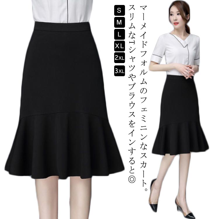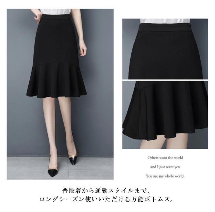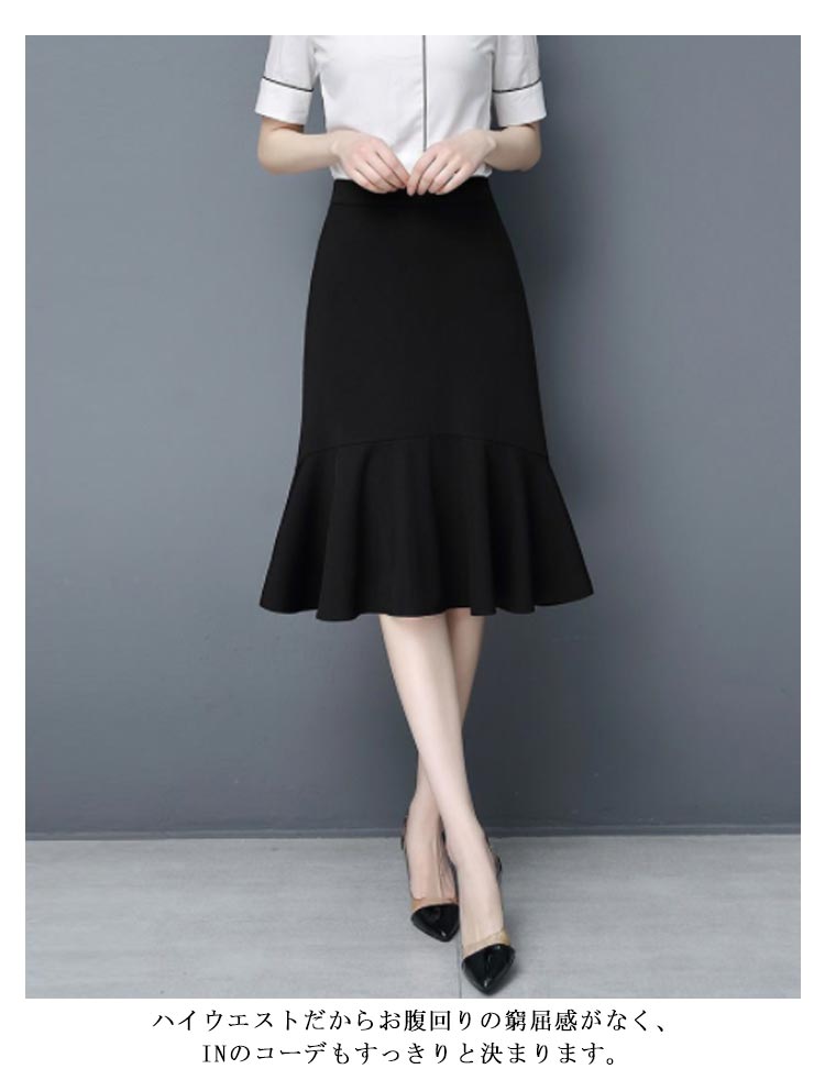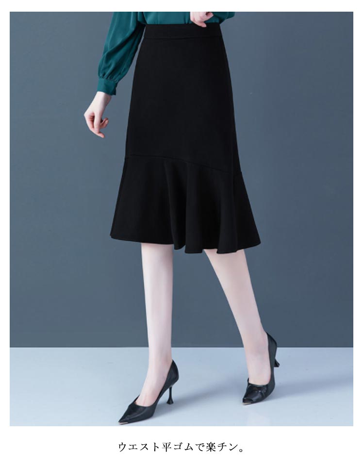 マーメイド スカート ブラック フリルスカート ハイウエスト 平ゴム 通勤 キレイめ 膝丈 送料無料