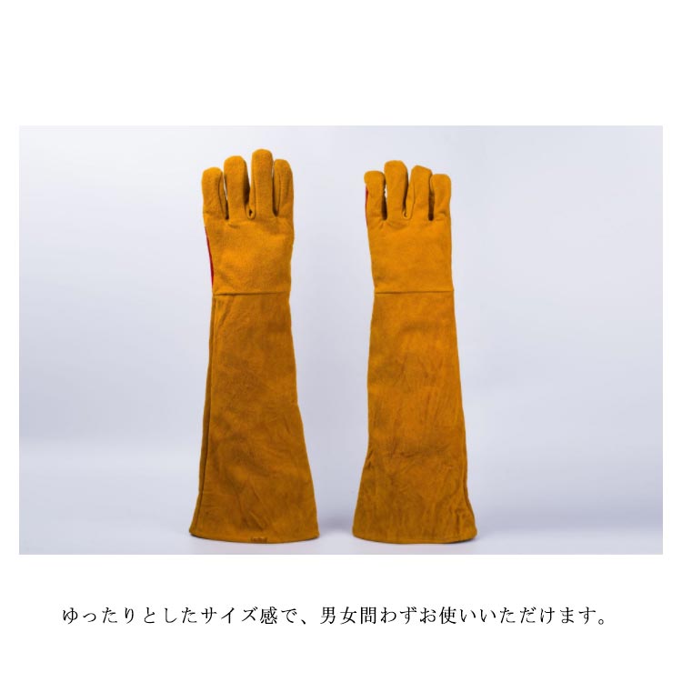 直接肌の当たる部分には、裏地として、肌触りの良い素材を使用しておりますので、イヤな感触も無く、使いやすく出来ている事もポイントです。犬や猫、爬虫類などのペットを扱う際に噛みつきや引っかきから手を守るための手袋です。 皮革を使用した厚手の作りで、耐摩耗性・耐熱性に優れています。噛まれても皮革がペットの歯に耐えるため、傷を負うことなく安心して作業ができます。また、耐熱性に優れているため、キャンプやBBQなどのアウトドアシーンでも活躍します。ゆったりとしたサイズ感で、男女問わずお使いいただけます。