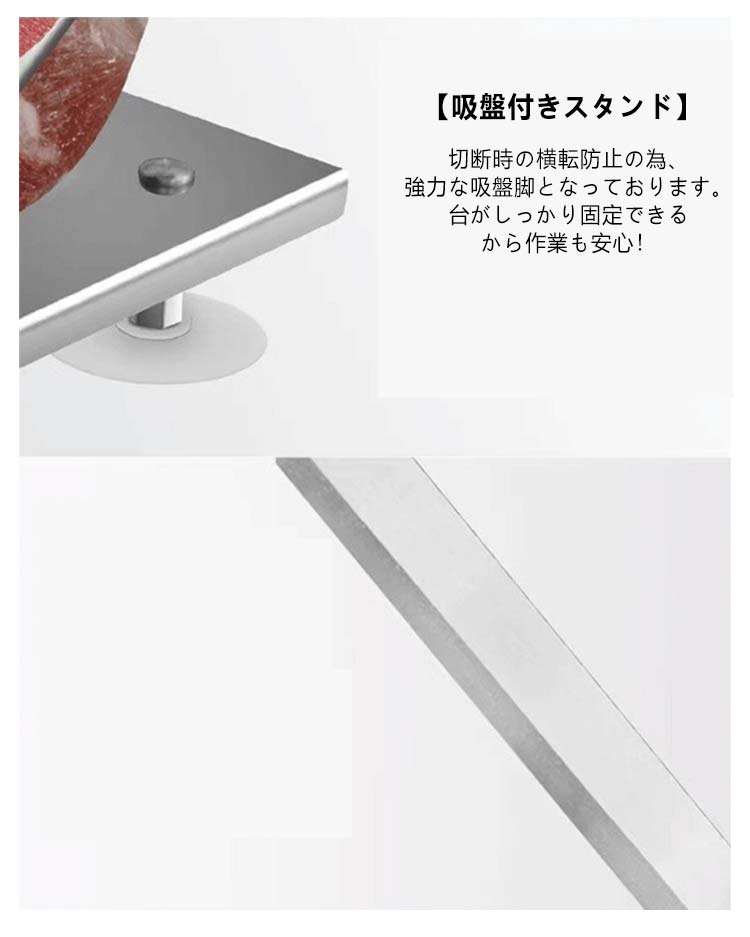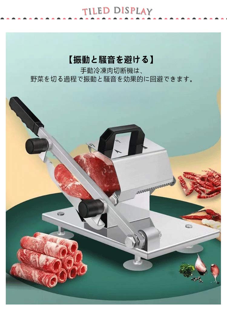 さまざまな食材から冷凍食品までスライスできる器具です。【振動と騒音を避ける】手動冷凍肉切断機は、野菜を切る過程で振動と騒音を効果的に回避できます。【異なる厚さの肉をカット】ノブを少し回すだけで、肉の厚さを調整できます。操作もお手入れも簡単です。【吸盤付きスタンド】切断時の横転防止の為、強力な吸盤脚となっております。台がしっかり固定できるから作業も安心!【丸洗い可能】ステンレス素材の為、錆びにくくシンプルな設計により丸洗い可能。【幅広い用途】手動冷凍肉カッターは、鍋、寿司、ピザ調味料、サンドイッチ、生姜の準備など、冷凍肉をさまざまな用途にカットするのに役立ちます。