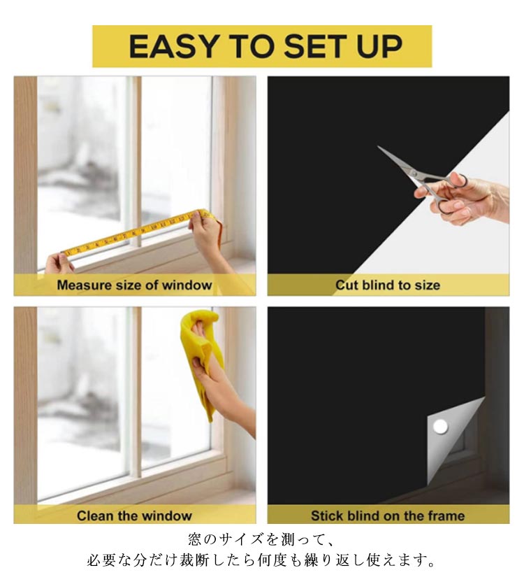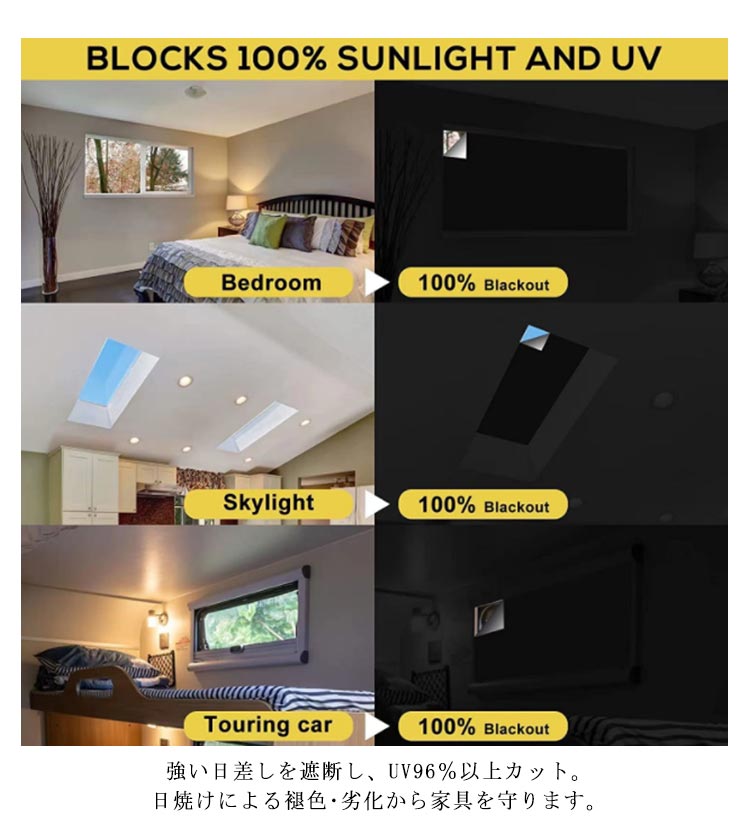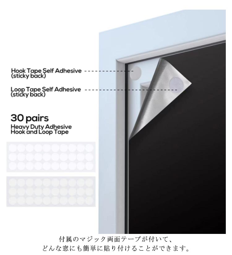 | カーテンレールのない窓に最適!マジックテープ窓遮光シートが新登場。 付属のマジック両面テープが付いて、どんな窓にも簡単に貼り付けることができます。 窓のサイズを測って、必要な分だけ裁断したら何度も繰り返し使えます。 防水効果もあるため、自宅の窓やバスルームのドアなど、テープが貼り付けられるところであればお好きにご使用していただけます。 強い日差しを遮断し、UV96%以上カット。日焼けによる褪色?劣化から家具を守ります。 室外陽光阻まれて、たとえ猛暑が続くても、薄暗く涼しい雰囲気を持っています。 夏は強い日差しを遮断し室内温度の上昇を抑え、冬は室外の寒気を遮り、省エネ効果が期待できます。 | |