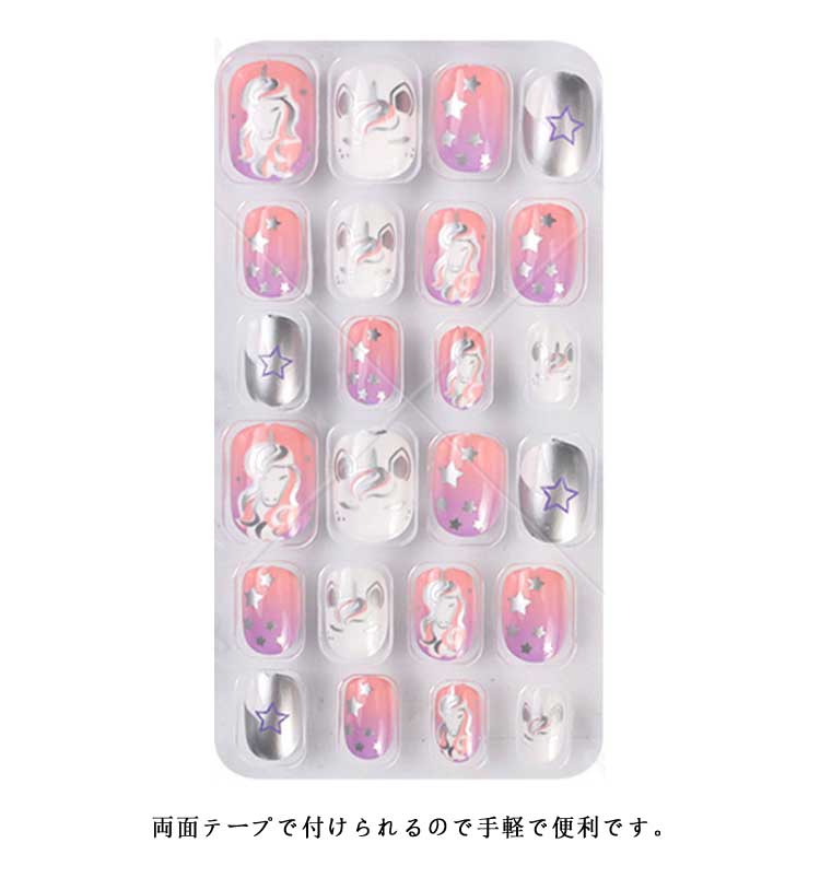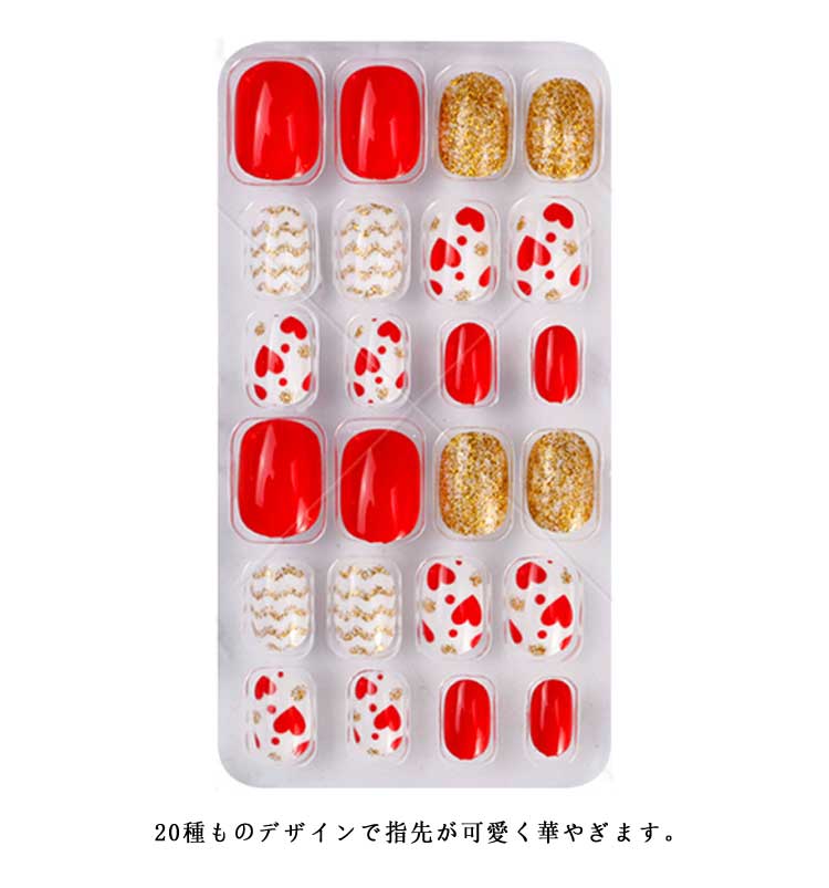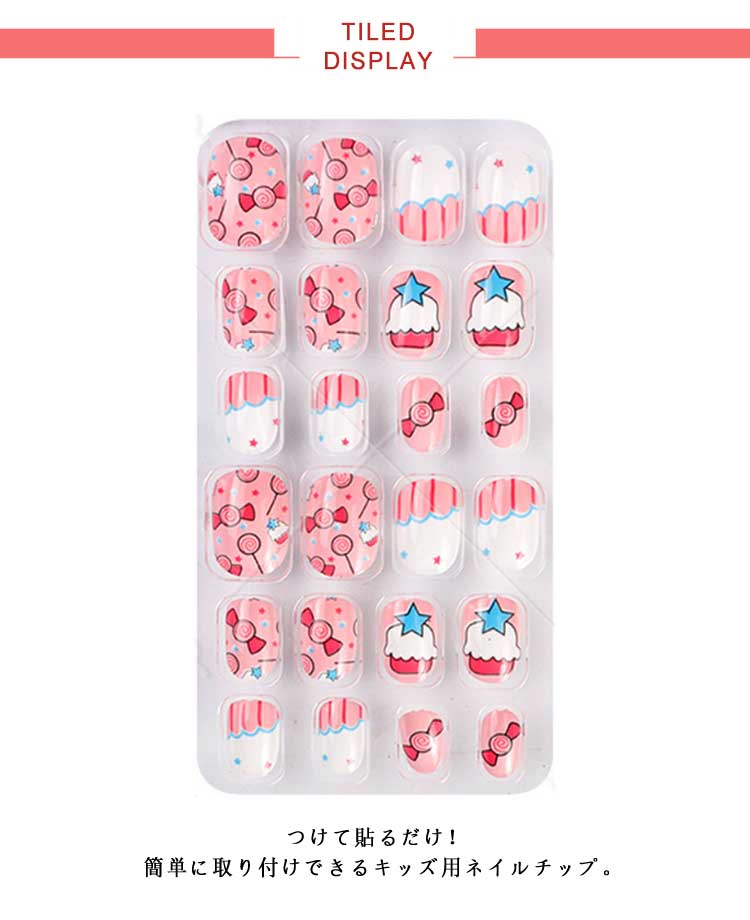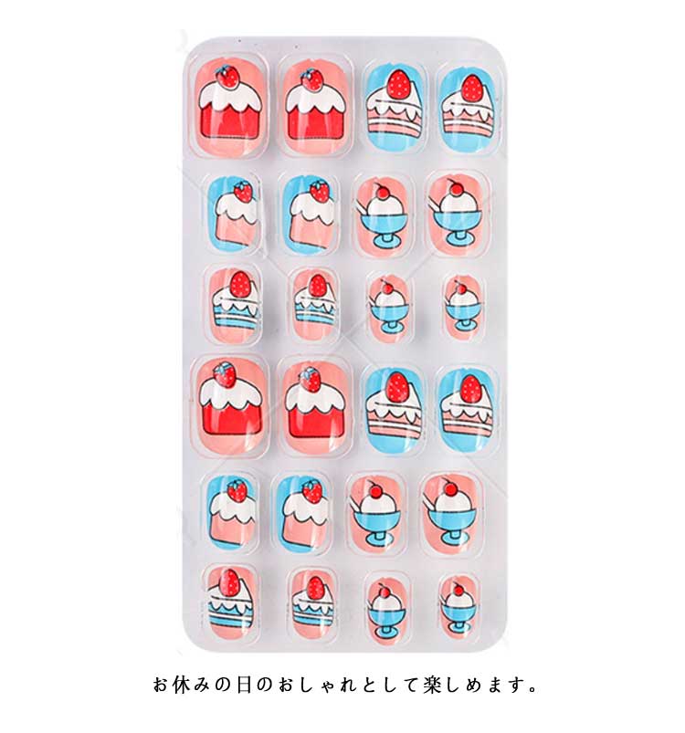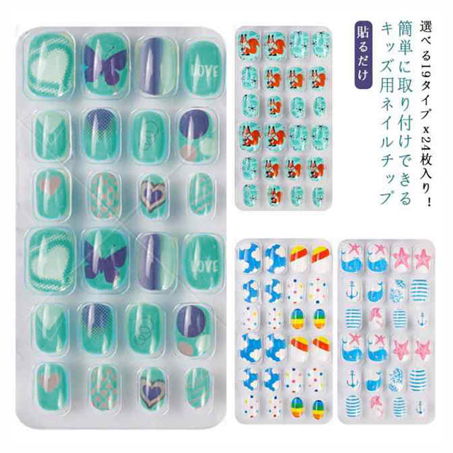 | 選べる19タイプx24枚入り!つけて貼るだけ! 簡単に取り付けできるキッズ用ネイルチップ。 両面テープで付けられるので手軽で便利です。 20種ものデザインで指先が可愛く華やぎます。 お休みの日のおしゃれとして楽しめます。 | |