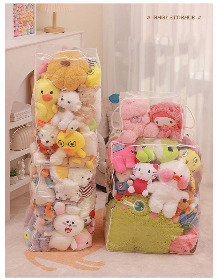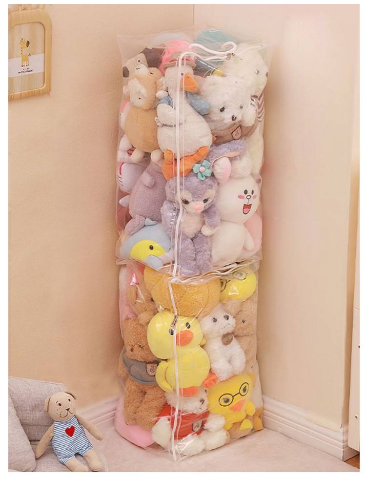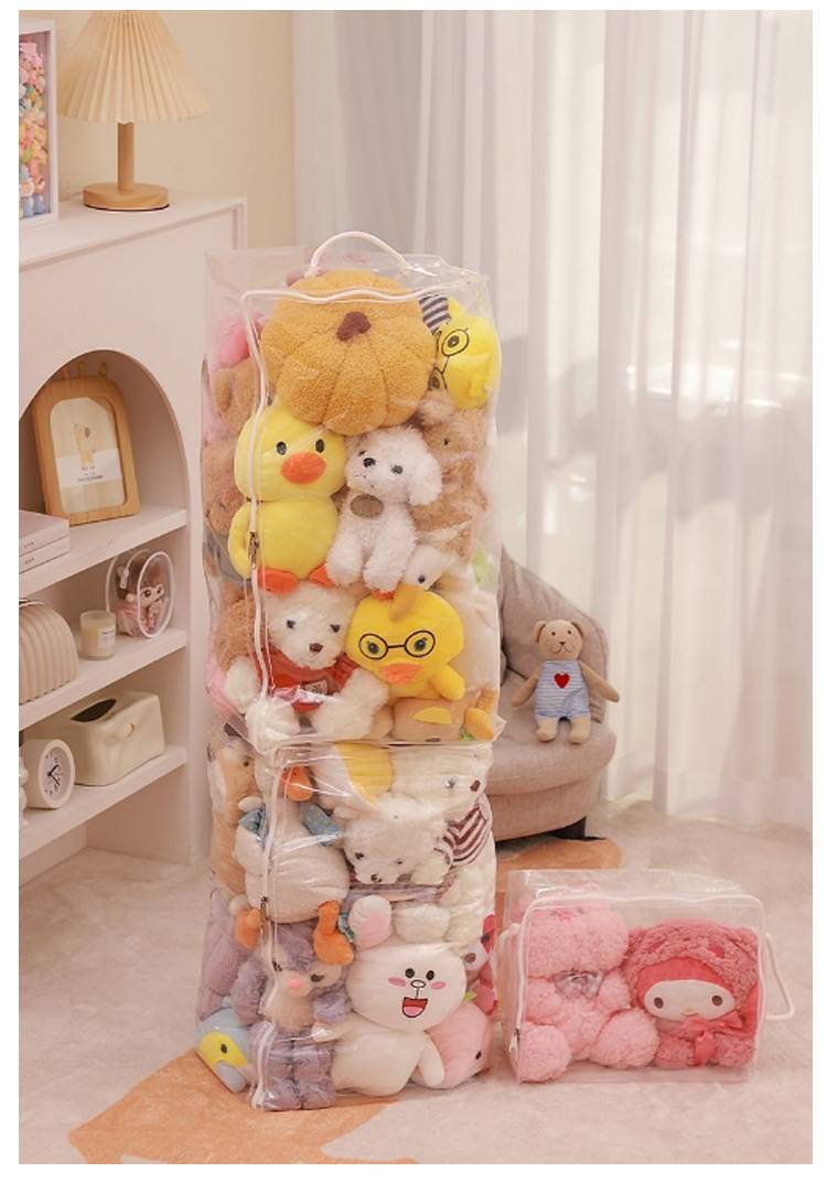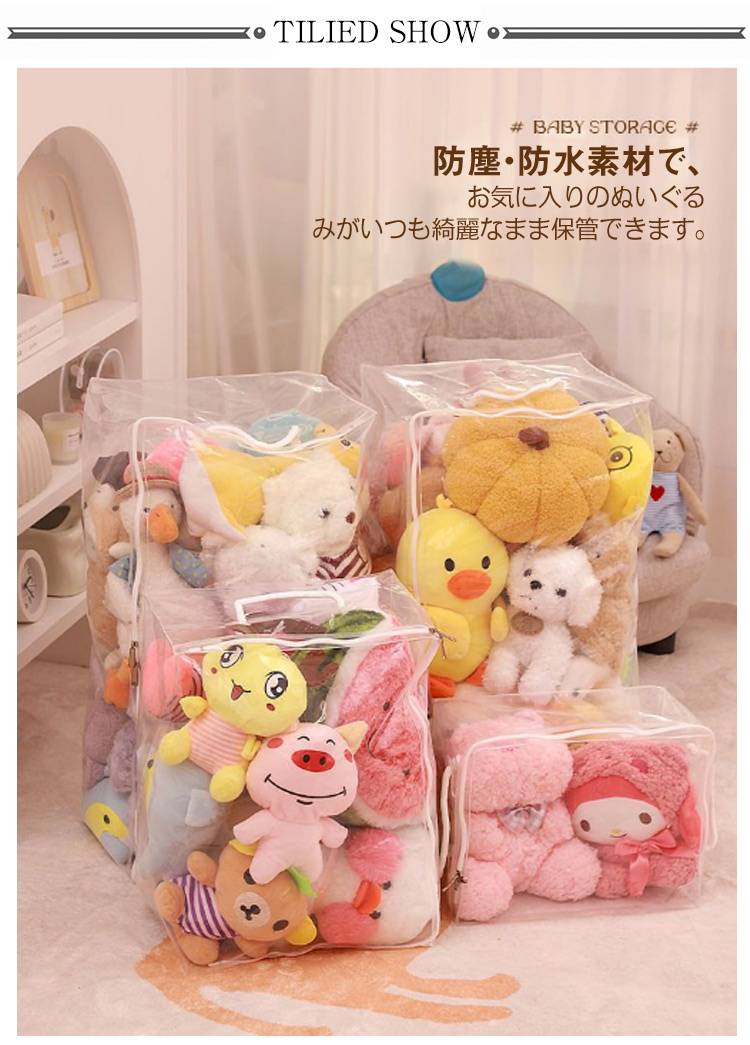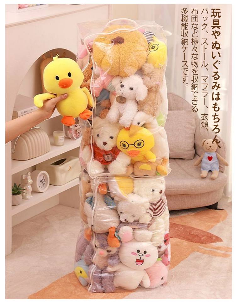 | まとめ収納可能? 見せながら収納できるぬいぐるみ収納袋。 防塵?防水素材で、お気に入りのぬいぐるみがいつも綺麗なまま保管できます。 クリアなので、中身が見えるから確認が簡単にできます。 玩具やぬいぐるみはもちろん、バッグ、ストール、マフラー、衣類、布団など様々な物を収納できる多機能収納ケースです。 | |