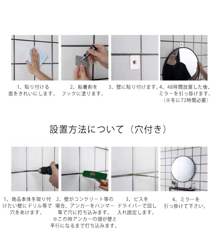 | 軽量なので、取付も安心で便利。 シンプルなデザインが玄関だけでなく、リビングや洗面所まで、どんなお部屋にもしっくりと馴染む何かと使える丸の鏡です。 穴をあけ/粘着 2種類の引っ掛け方法で壁にフックを取付ができないも便利です。 | |