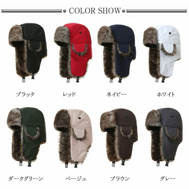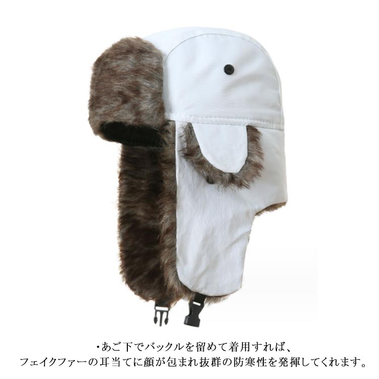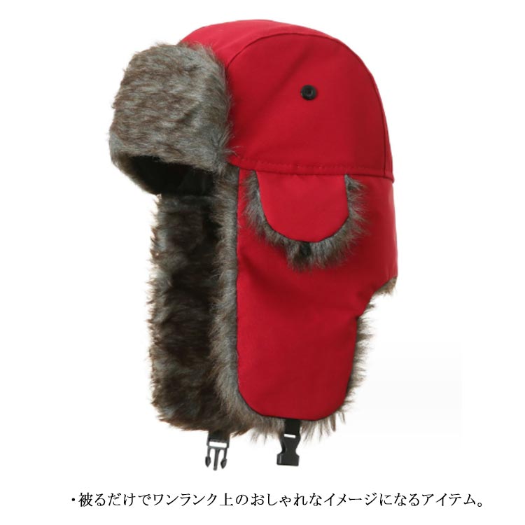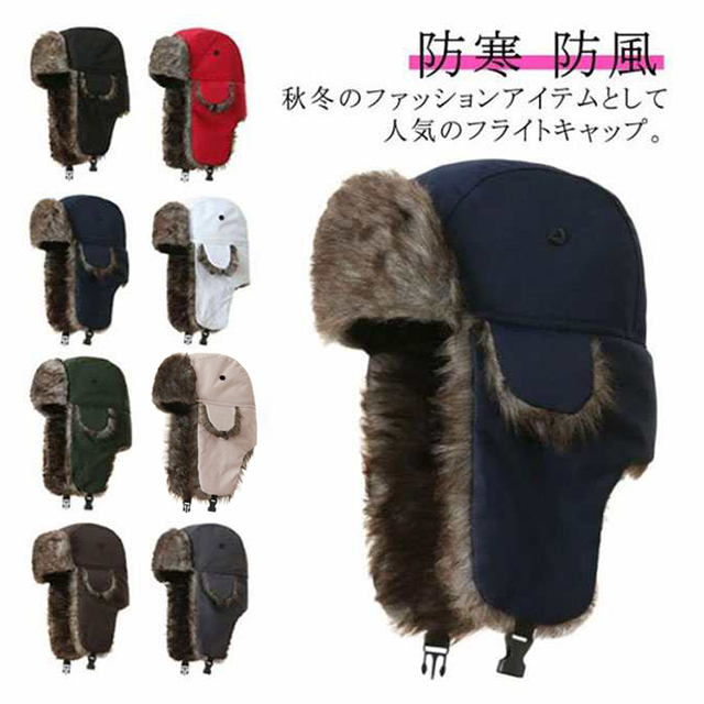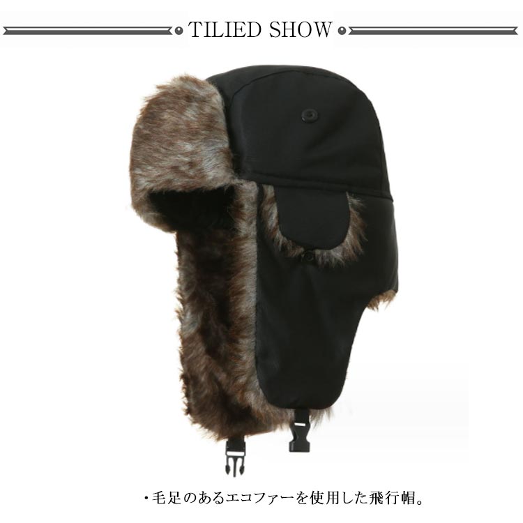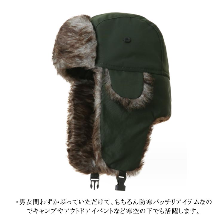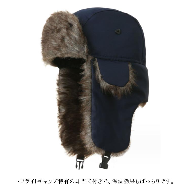 ・秋冬のファッションアイテムとして人気のフライトキャップ。・毛足のあるエコファーを使用した飛行帽。・被るだけでワンランク上のおしゃれなイメージになるアイテム。・フライトキャップ特有の耳当て付きで、保温効果もばっちりです。・あご下でバックルを留めて着用すれば、フェイクファーの耳当てに顔が包まれ抜群の防寒性を発揮してくれます。・男女問わずかぶっていただけて、もちろん防寒バッチリアイテムなのでキャンプやアウトドアイベントなど寒空の下でも活躍します。