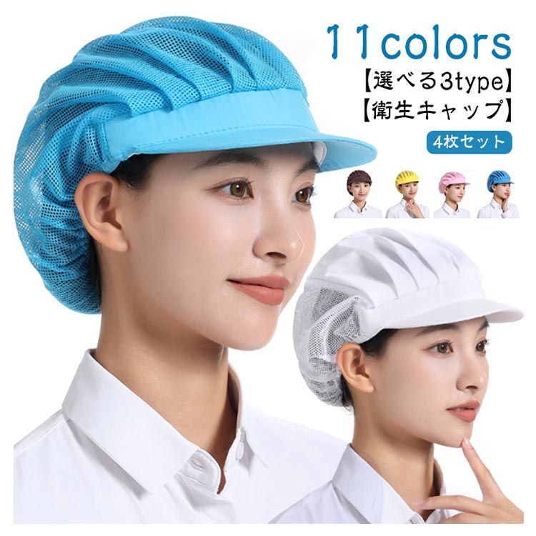【衛生キャップ】【4枚セット】【選べる3type】【11colors】食品工場や飲食店の厨房など、幅広くご使用いただける衛生帽の4枚セットです。メッシュタイプで通気性が良く、長時間の着用でも蒸れにくくなっています。後ろ部分は伸縮性に優れたゴム素材になっており、男女問わずご使用いただけます。髪の毛を入れるゆとりのあるデザインで、ロングヘアの方でもスッキリと収まります。4枚セットなので洗い替えにも便利です。微細メッシュが抜け毛や埃をしっかりキャッチし、通気性もよく、美観実用。