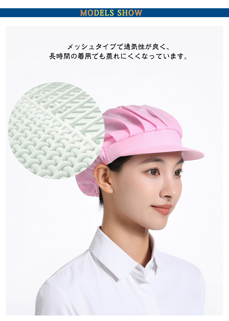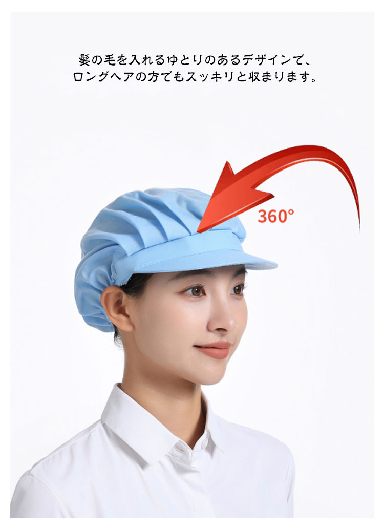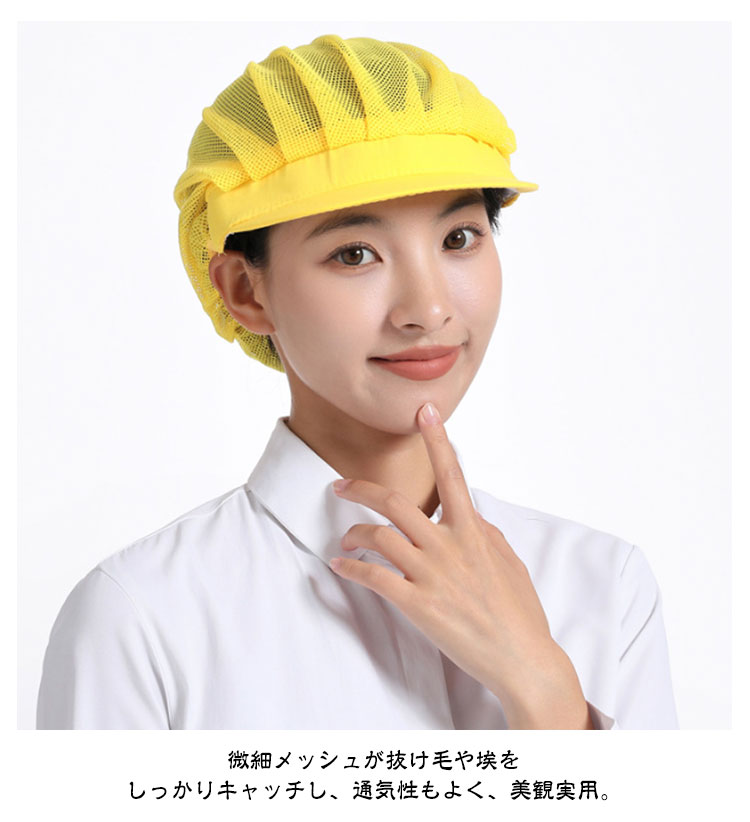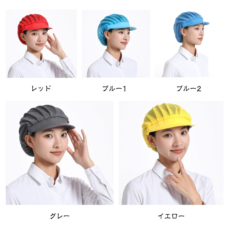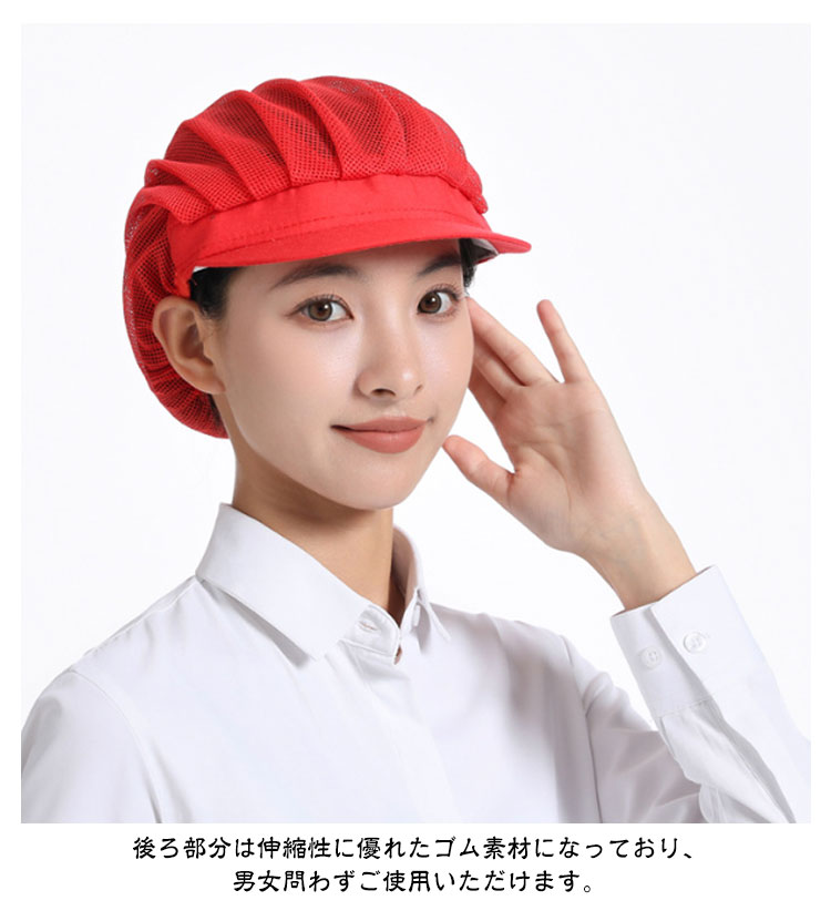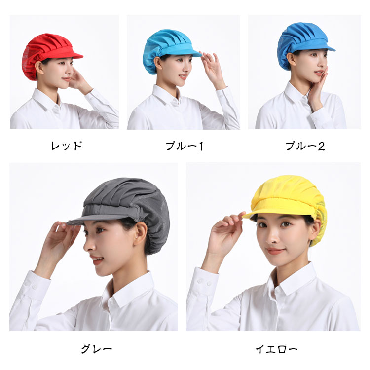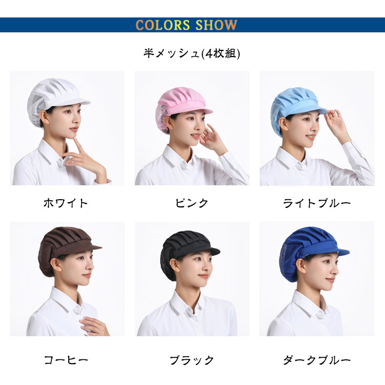 | 【衛生キャップ】【4枚セット】【選べる3type】【11colors】 食品工場や飲食店の厨房など、幅広くご使用いただける衛生帽の4枚セットです。 メッシュタイプで通気性が良く、長時間の着用でも蒸れにくくなっています。 後ろ部分は伸縮性に優れたゴム素材になっており、男女問わずご使用いただけます。 髪の毛を入れるゆとりのあるデザインで、ロングヘアの方でもスッキリと収まります。 4枚セットなので洗い替えにも便利です。 微細メッシュが抜け毛や埃をしっかりキャッチし、通気性もよく、美観実用。 | |