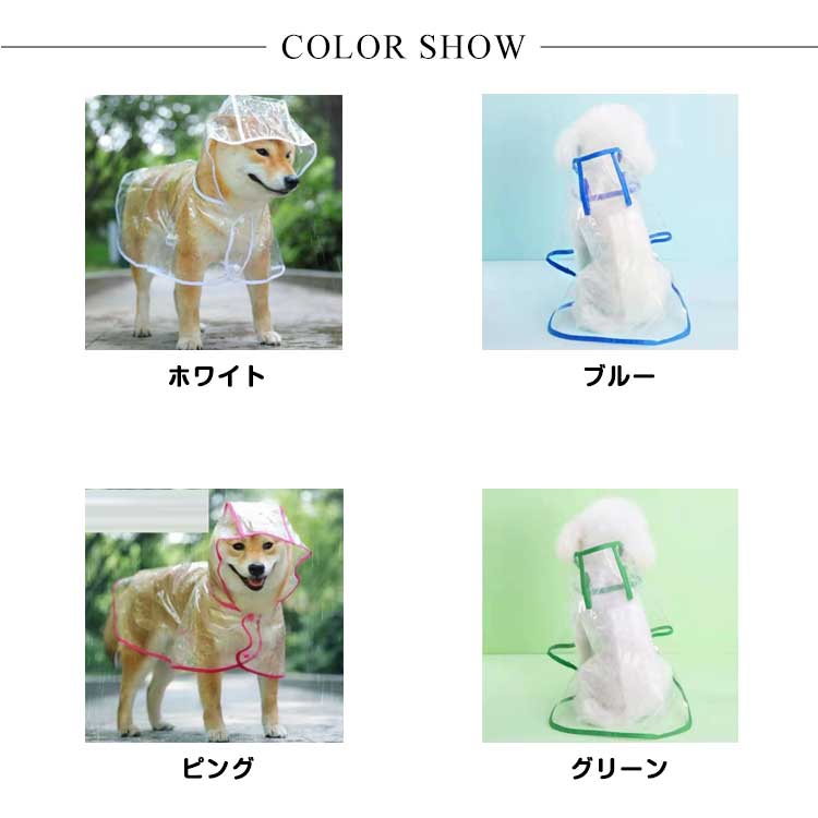 | 大人気の犬用透明レインコート。 安全なプラスチック素材のペット雨具。 着せ易いポンチョタイプ。 雨の日や雨上がりのお散歩に欠かせないアイテム? 簡単に装着できる、軽くて、折り畳んで収納できます。 雨の日はもちろん、寒さ対策に、風よけに、そして花粉よけにも、様々な用途で活躍です。 | |