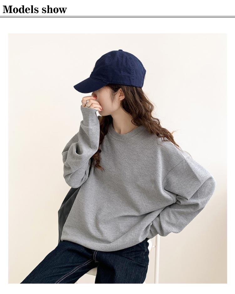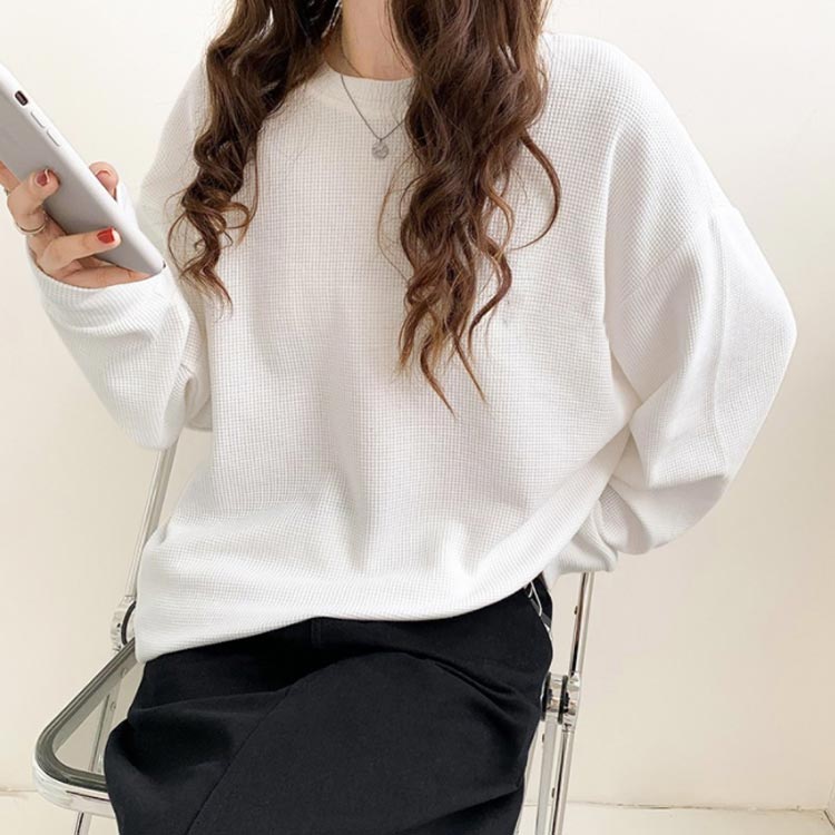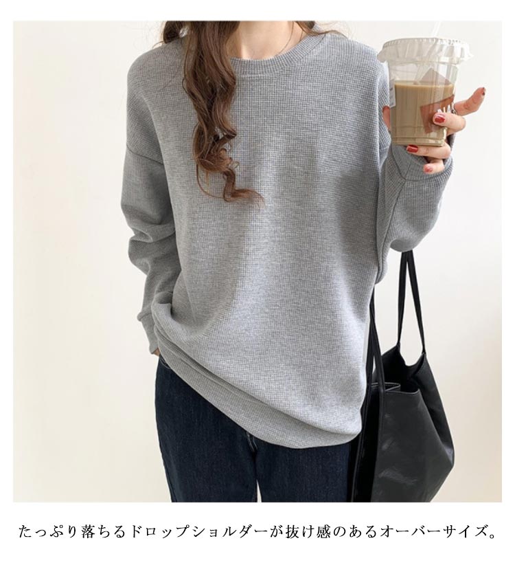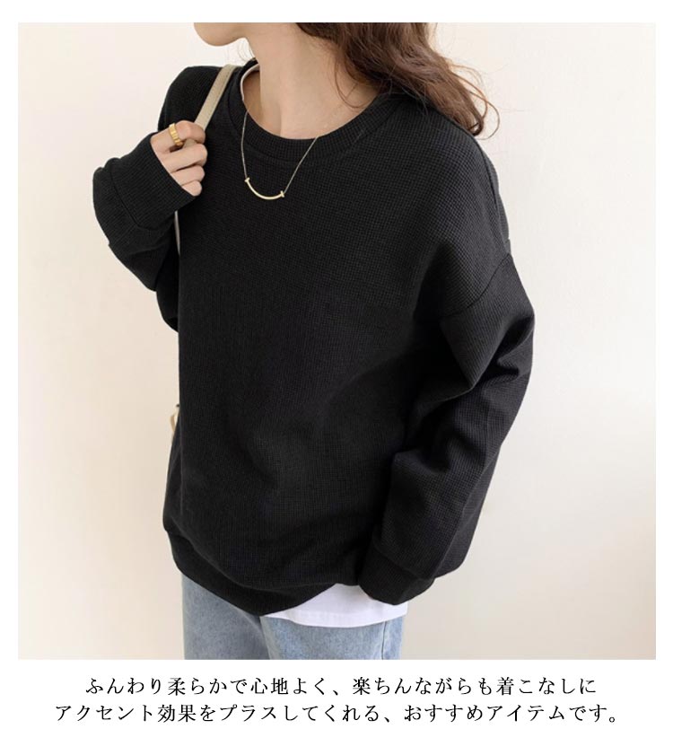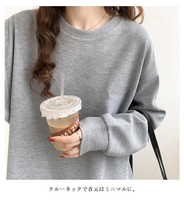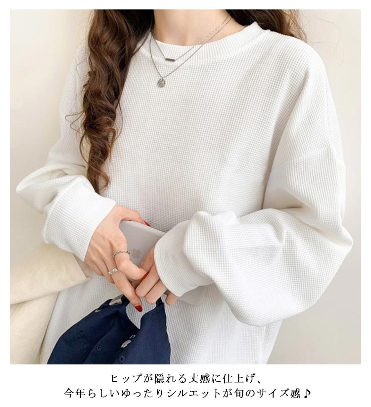 ワッフル トップス レディース トレーナー カットソー ロンT 春 ゆったり 大きいサイズ オーバーサイズ 韓国 長袖 ドロップショルダー プルオーバー スウェット 体型カバー Tシャツ クルーネック シンプル 無地 カジュアル 抜け感