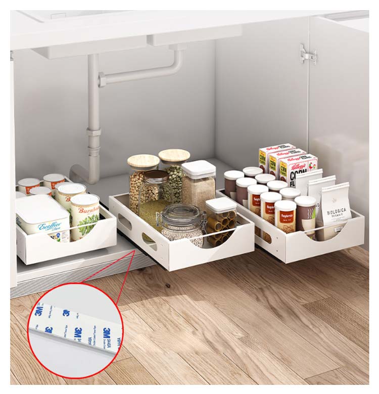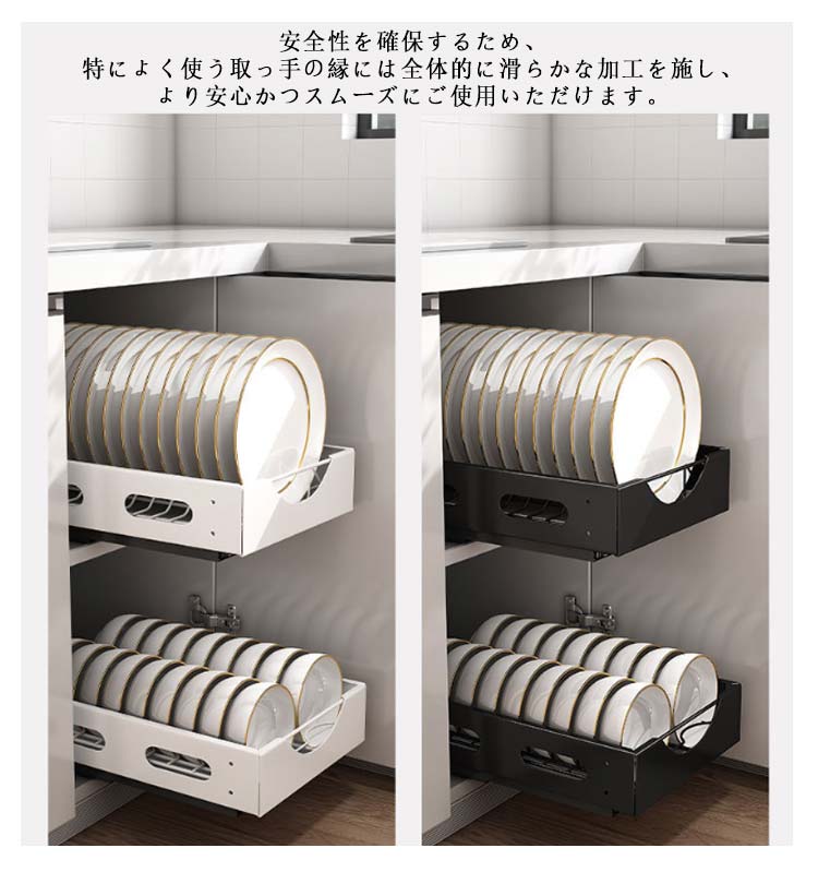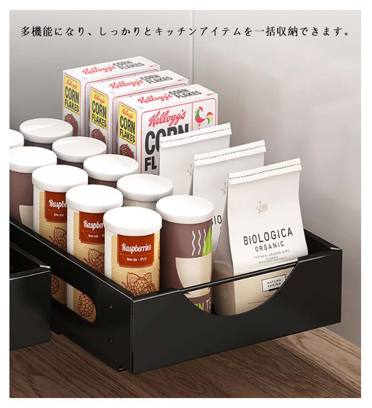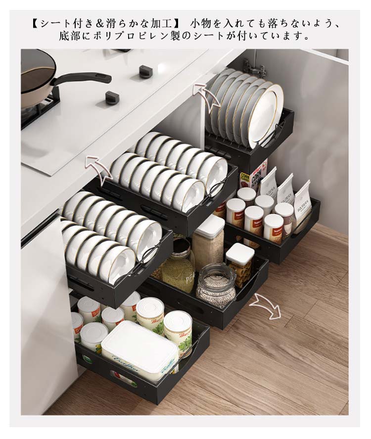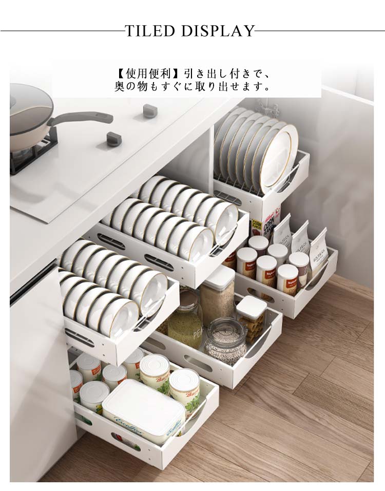 シンク下 水切りラック【使用便利】引き出し付きで、奥の物もすぐに取り出せます。【取付簡単&省スペース】隙間があれば設置可能で、空間を有効活用できます。【シート付き&滑らかな加工】 小物を入れても落ちないよう、底部にポリプロピレン製のシートが付いています。安全性を確保するため、特によく使う取っ手の縁には全体的に滑らかな加工を施し、より安心かつスムーズにご使用いただけます。【様々なシーンで大活躍】 冷蔵庫のサイドはもちろん、用途に合わせて電子レンジの隣やテーブル上の隅などに置くこともできます。多機能になり、しっかりとキッチンアイテムを一括収納できます。