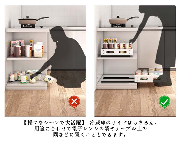 | シンク下 水切りラック 【使用便利】引き出し付きで、奥の物もすぐに取り出せます。 【取付簡単&省スペース】隙間があれば設置可能で、空間を有効活用できます。 【シート付き&滑らかな加工】 小物を入れても落ちないよう、底部にポリプロピレン製のシートが付いています。安全性を確保するため、特によく使う取っ手の縁には全体的に滑らかな加工を施し、より安心かつスムーズにご使用いただけます。 【様々なシーンで大活躍】 冷蔵庫のサイドはもちろん、用途に合わせて電子レンジの隣やテーブル上の隅などに置くこともできます。多機能になり、しっかりとキッチンアイテムを一括収納できます。 | |