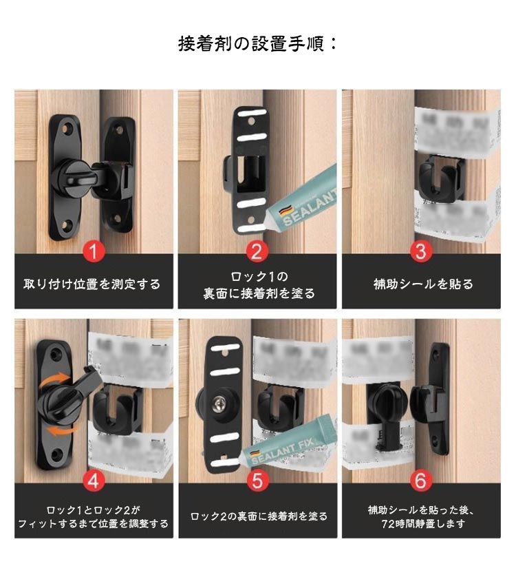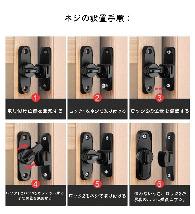 【穴あけ不要】【90度/180度兼用】【2WAY取付】亜鉛合金のドアバックルは、丈夫で防錆性に優れ、耐久性に優れています。スムーズに回転でき、ワンタッチに簡単に開閉できます。90度も180度も取り付けられるから、開き戸も引き戸も様々なドアに対応できます。便利なフリップデザイン、プライバシーロック、フラップは、より快適な生活環境のためにさらなるセキュリティを提供します。ネジまたは接着剤の2通りの取り付け方法あります。適切な位置にネジを取り付けるだけで完成し、使いやすい。子供ケガ防止だけでなく、部屋の外に出ていかないようにしたり、様々な危険を防止できます。簡単施錠でスライドドアの防犯対策ができます。猫の脱走防止用としてもお使いいただけます。ネジの設置手順:取り付け位置を測定するロック1をネジで取り付けるロック2の位置を調整するロック1とロック2がフィットするまで位置を調整するロック2をネジで取り付ける使わないとき、ロック2が写真のように垂直にする。接着剤の設置手順:取り付け位置を測定するロック1の裏面に接着剤を塗る補助シールを貼るロック1とロック2がフィットするまで位置を調整するロック2の裏面に接着剤を塗る補助シールを貼った後、72時間静置します