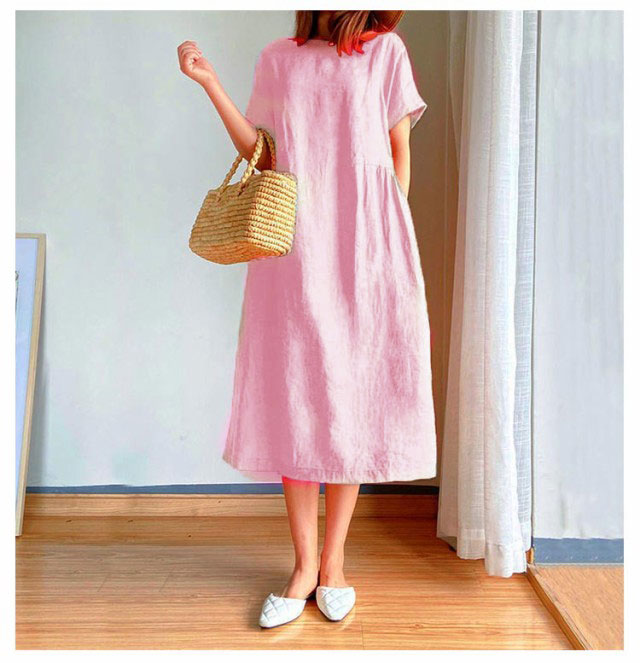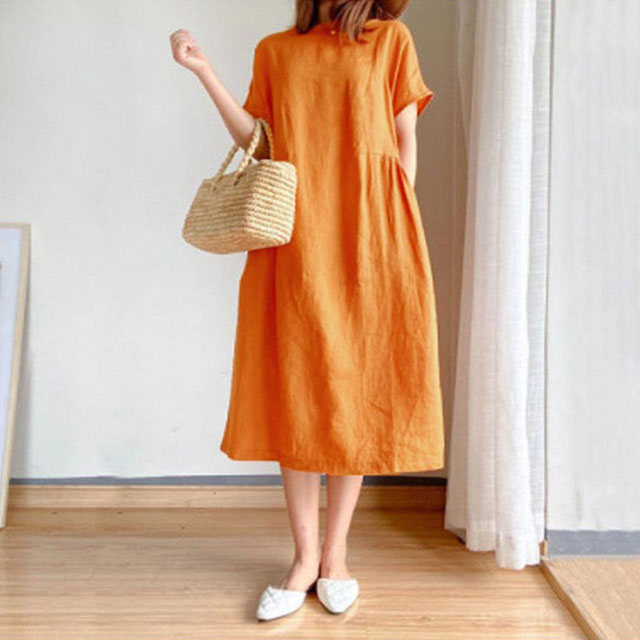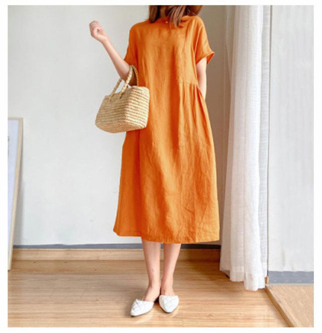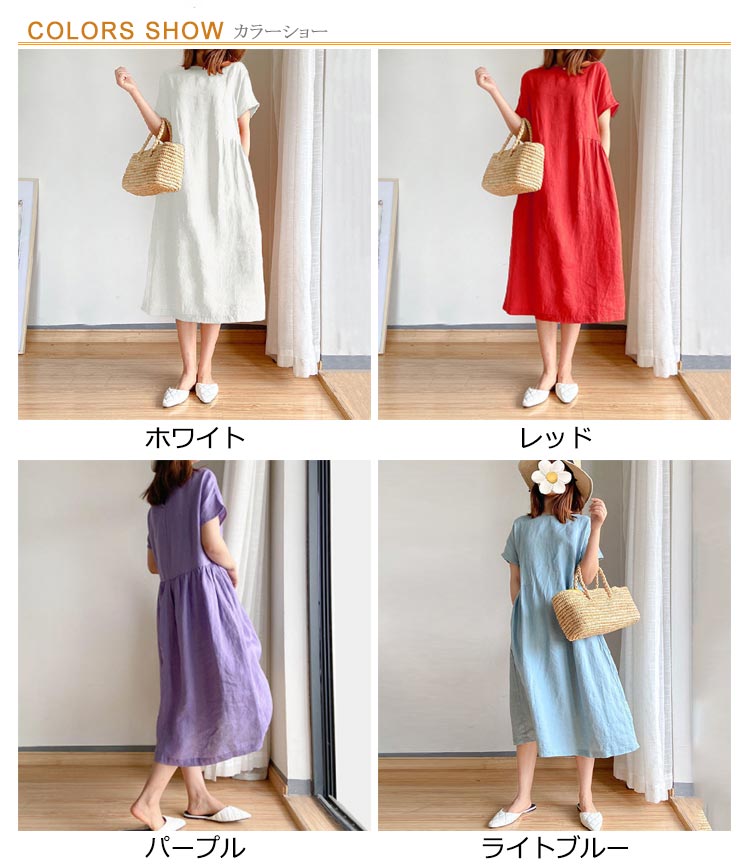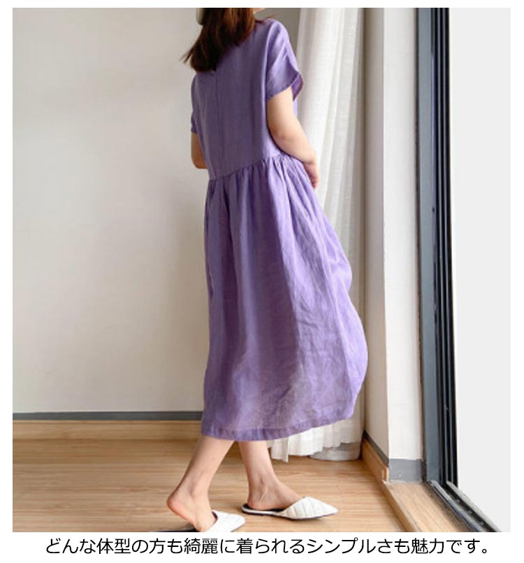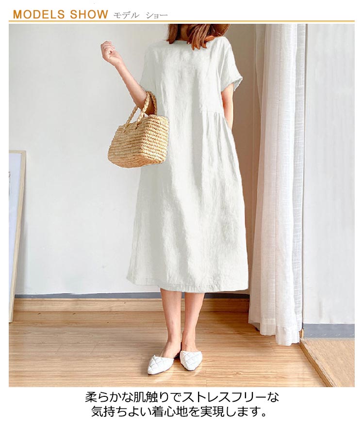 全9色×6サイズナチュラルな風合いで清涼感のある綿麻素材を使用したワンピース。柔らかな肌触りでストレスフリーな気持ちよい着心地を実現します。ゆったりとしたシルエットでさりげなく体型をカバーしてくれます。どんな体型の方も綺麗に着られるシンプルさも魅力です。