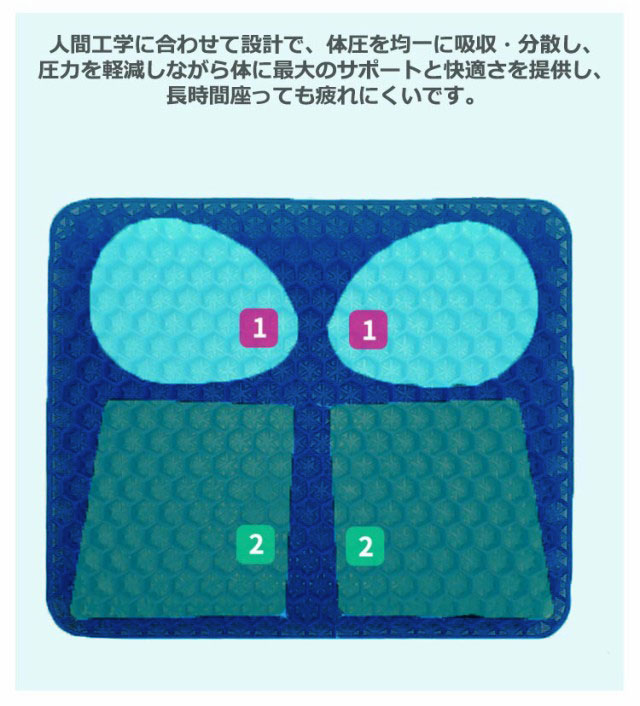 洗濯できるクッションカバー付き!人間工学に合わせて設計で、体圧を均一に吸収・分散し、圧力を軽減しながら体に最大のサポートと快適さを提供し、長時間座っても疲れにくいです。暑さを吸収・分散してサポートし正しい姿勢を保ちます。柔ら材質で椅子にも使えます、平らな椅子の表面に直接座るよりも座り心地がよい。高弾性ゲル材料の特徴で、いくらストレッチ、絞ってもすぐ元に戻します、経済的にも性能的にも普通のクッションより優れております。色移り・色落ちしないようにカバー仕様を変更しました。カバーは取り外し式なので、洗濯も可能です。カバーの裏面はメッシュ生地を使用しており、通気性マックス。