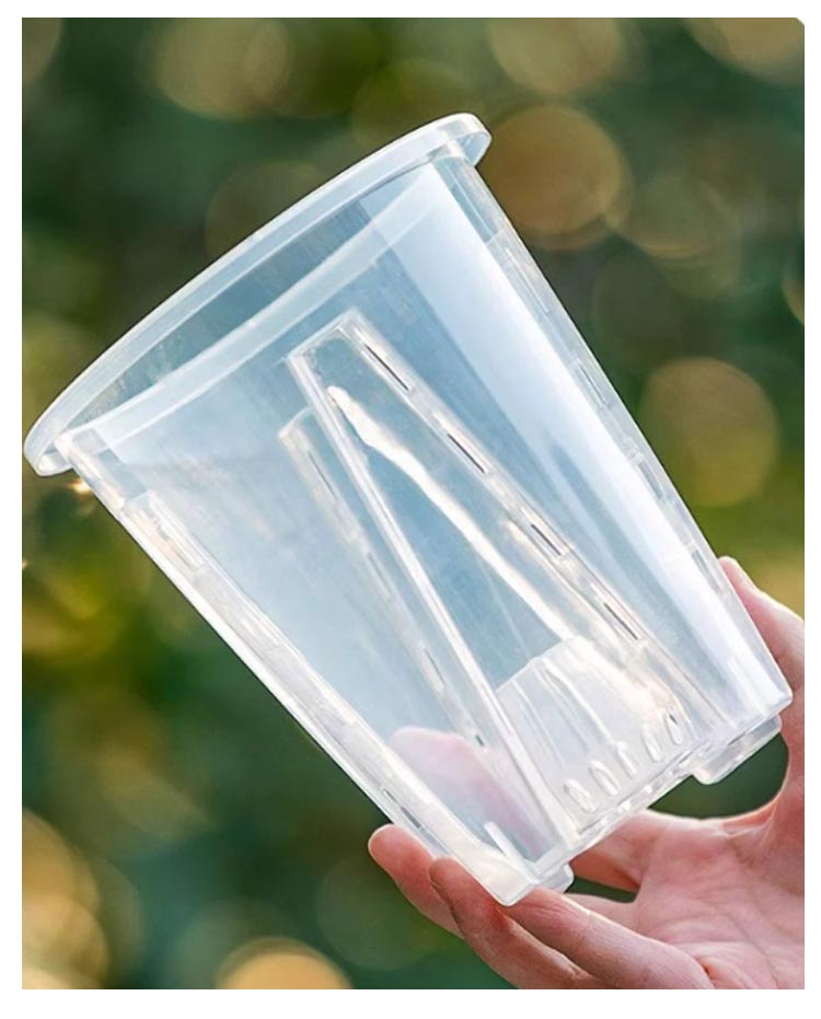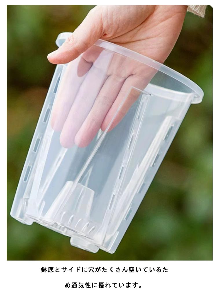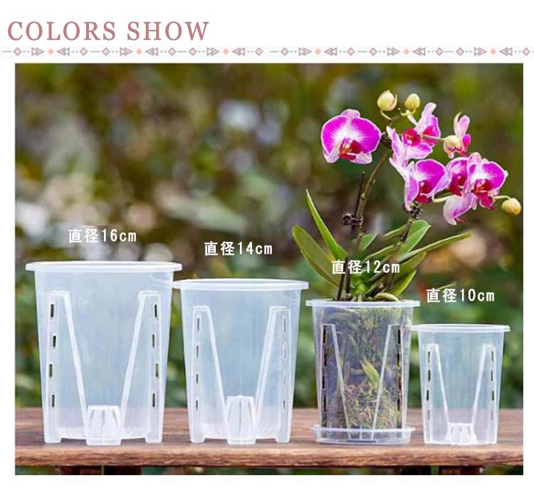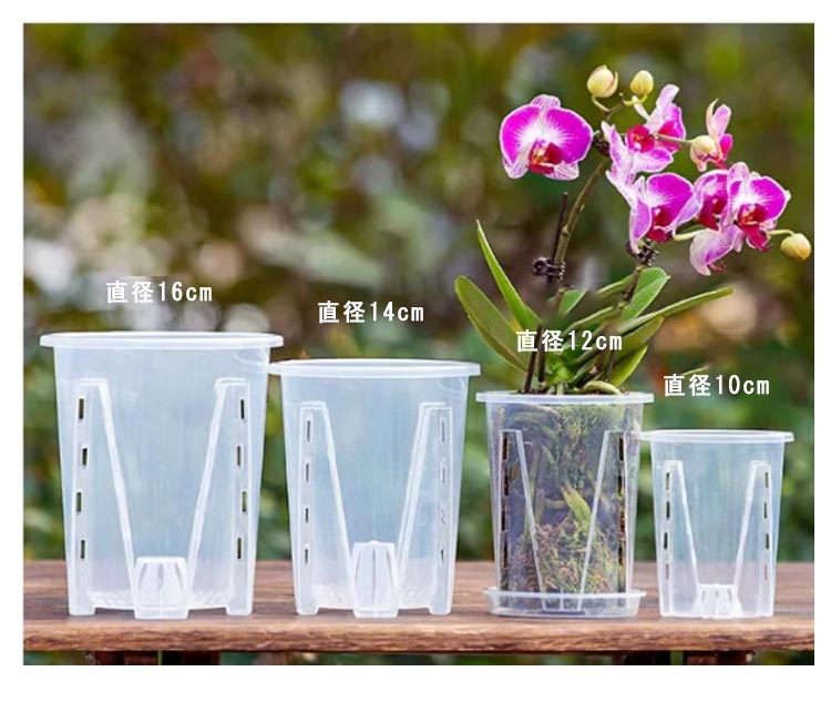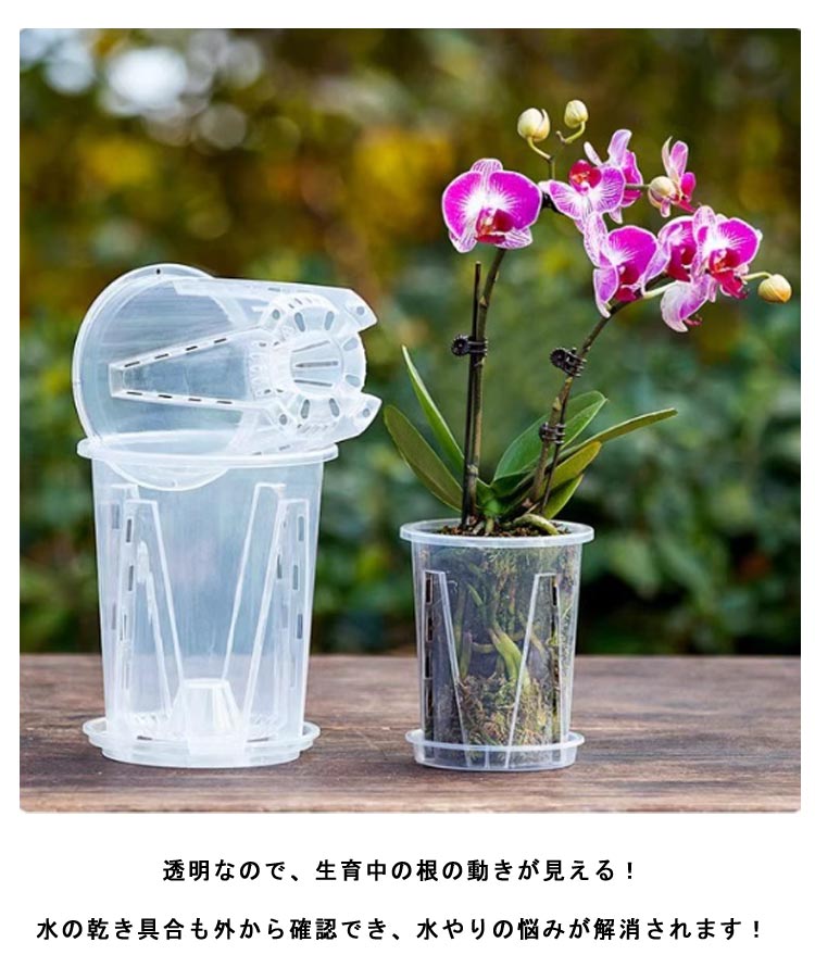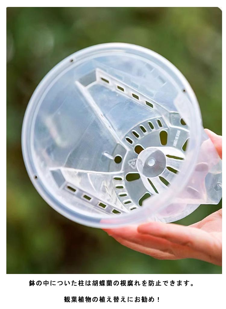 | 【胡蝶蘭用植木鉢と受皿 10鉢セット】 鉢底とサイドに穴がたくさん空いているため通気性に優れています。 鉢の中についた柱は胡蝶蘭の根腐れを防止できます。観葉植物の植え替えにお勧め! 透明なので、生育中の根の動きが見える!水の乾き具合も外から確認でき、水やりの悩みが解消されます! 胡蝶蘭だけでなく、多肉植物、アデニウムなど観葉植物の植え替えにもお勧め! | |