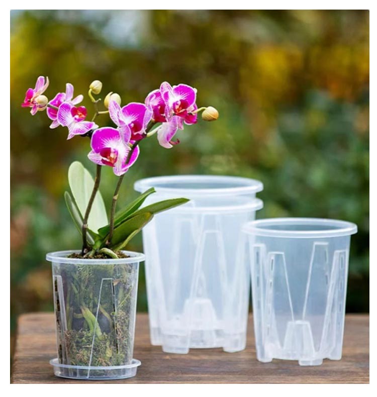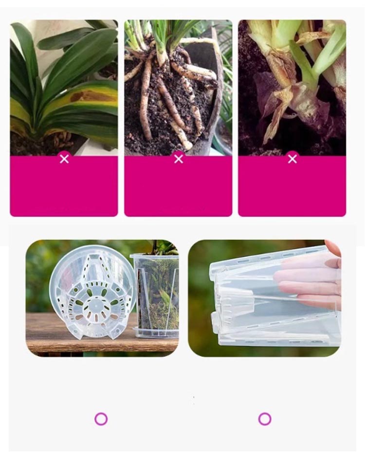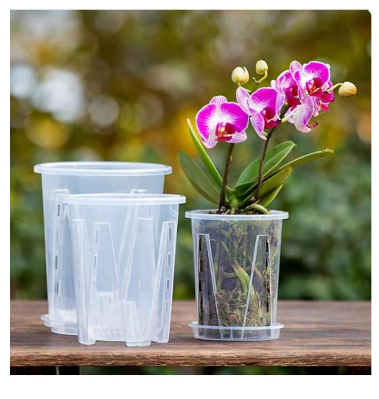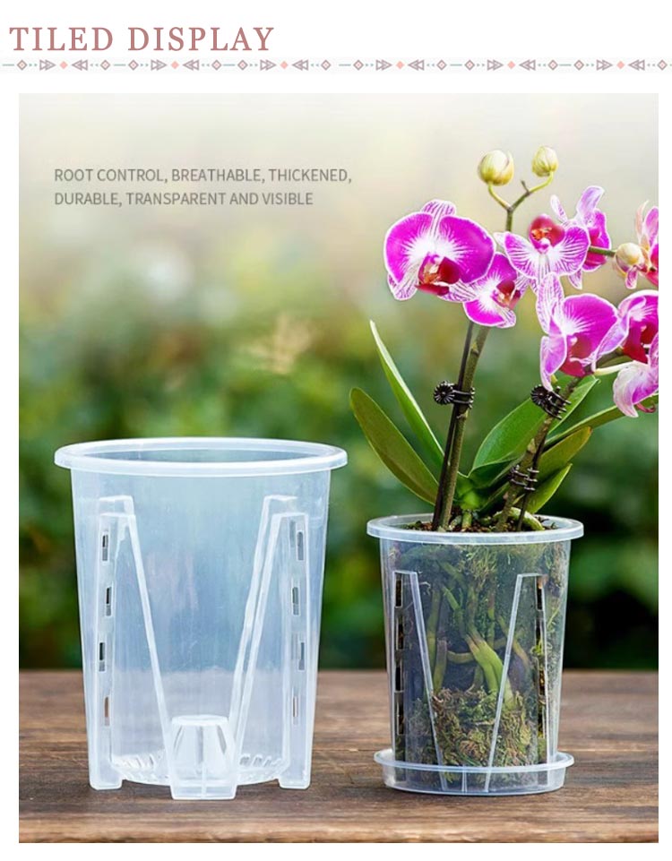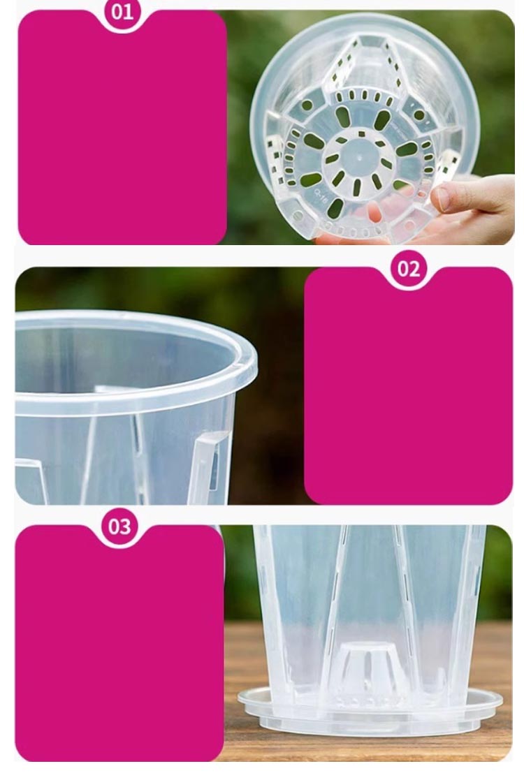 | 【胡蝶蘭用植木鉢と受皿 10鉢セット】 鉢底とサイドに穴がたくさん空いているため通気性に優れています。 鉢の中についた柱は胡蝶蘭の根腐れを防止できます。観葉植物の植え替えにお勧め! 透明なので、生育中の根の動きが見える!水の乾き具合も外から確認でき、水やりの悩みが解消されます! 胡蝶蘭だけでなく、多肉植物、アデニウムなど観葉植物の植え替えにもお勧め! | |