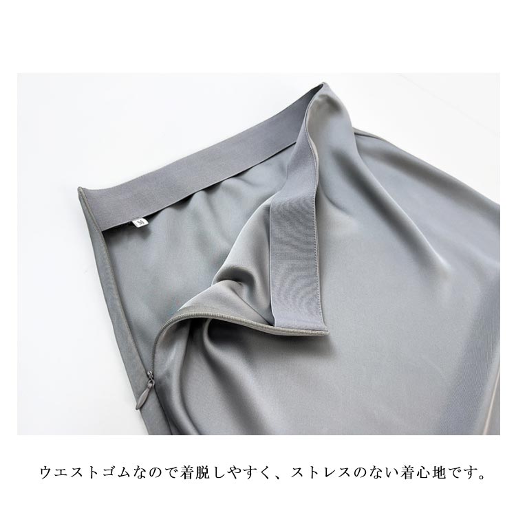 1年中着られる!コーディネートを上品に仕上げるフレアマーメイドスカート長めの着丈が大人っぽい印象のサテンロングスカート。マーメイドシルエットが、女性らしいシルエットを際立たせてくれます。マキシ丈なので体系カバーも◎ウエストゴムなので着脱しやすく、ストレスのない着心地です。バイアス取りすること裾に向かって緩やかに広がりでがる控えめなフレアシルエットが、女性らしさを引き立てています。合わせるトップスを選ばないので、幅広いスタイリングに重宝します。