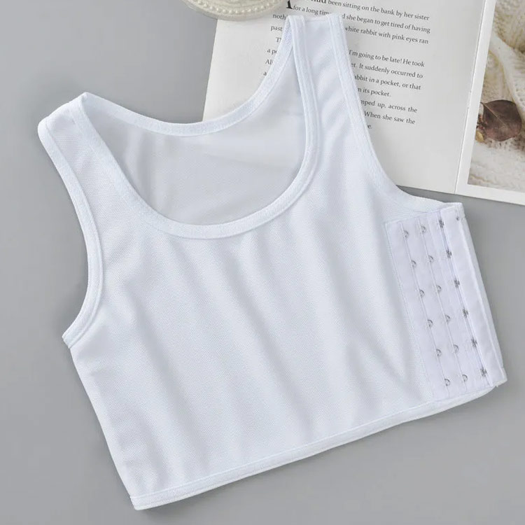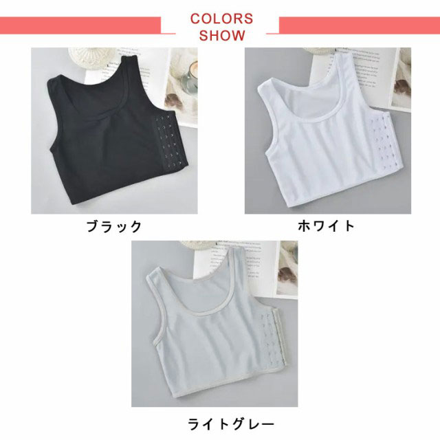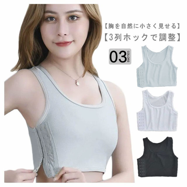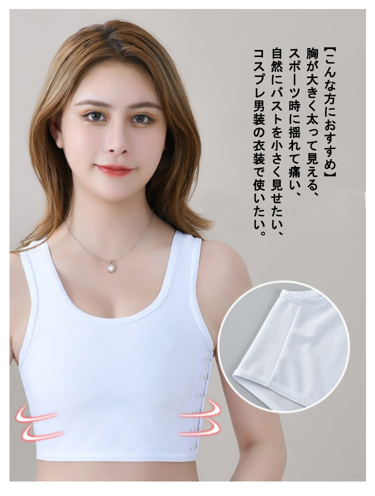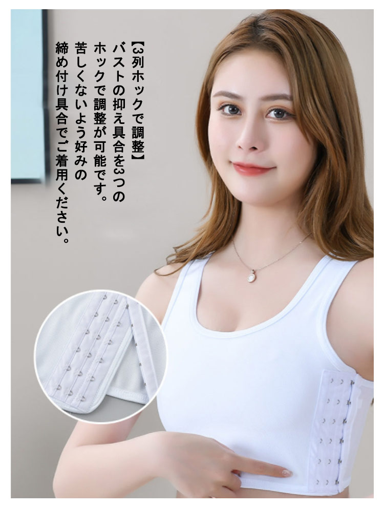 【着心地の良い素材】通気性の高いメッシュの使用と幅広く設計された肩の仕様で、着心地が良く長時間でも快適にご着用いただけます。【胸を自然に小さく見せる】胸つぶしシャツがバストを自然に潰す事で美しいシルエットに見せます。【3列ホックで調整】バストの抑え具合を3つのホックで調整が可能です。苦しくないよう好みの締め付け具合でご着用ください。【こんな方におすすめ】胸が大きく太って見える、スポーツ時に揺れて痛い、自然にバストを小さく見せたい、コスプレ男装の衣装で使いたい。