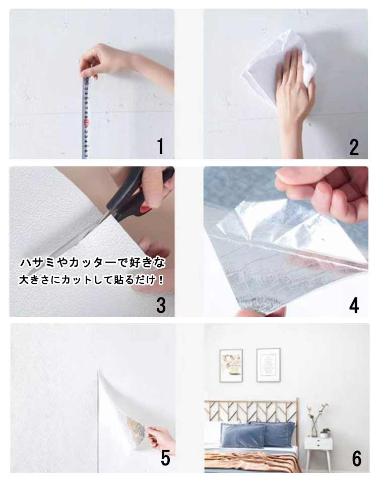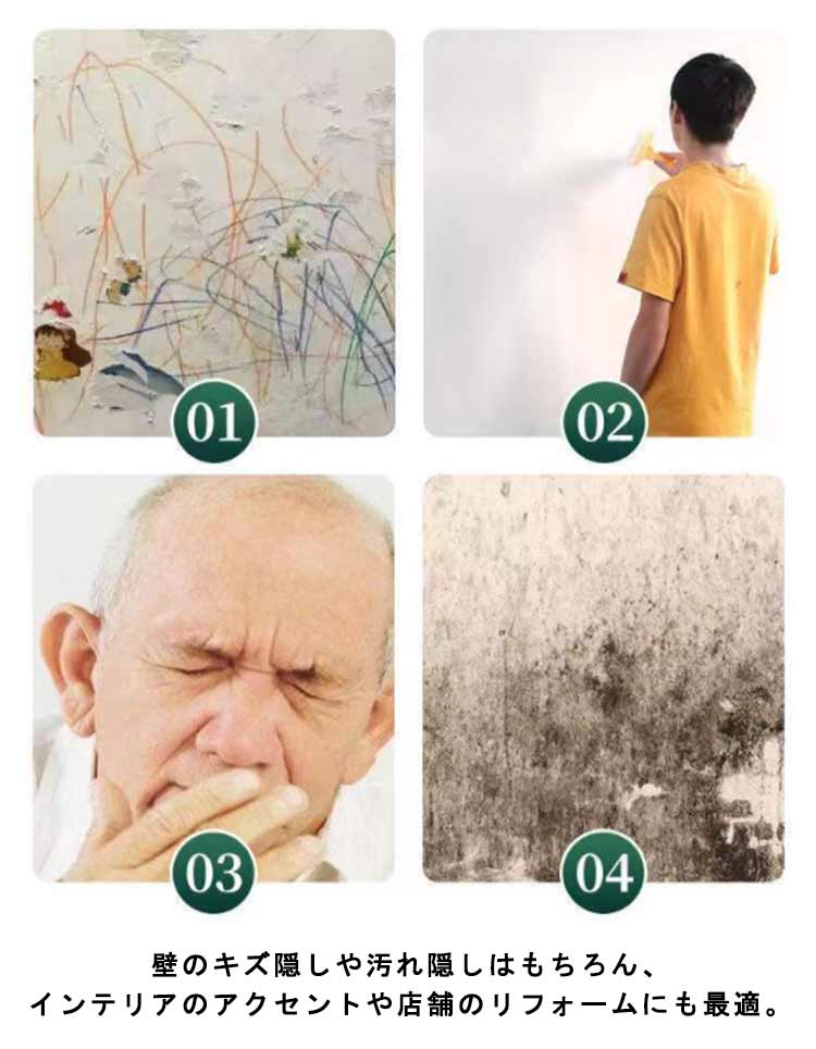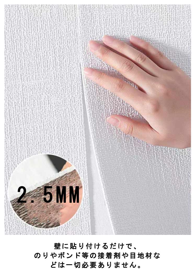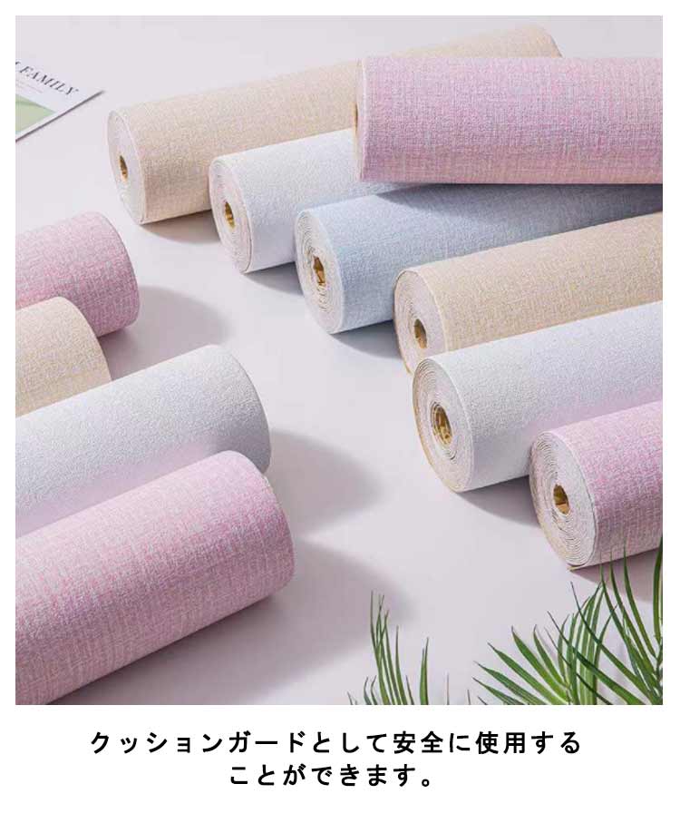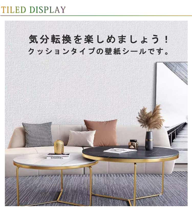 気分転換を楽しめましょう!クッションタイプの壁紙シールです。貼るだけの壁紙シールに断熱(保温)、結露カビ防止、緩衝効果、吸音性をプラス!表面は防水加工をしているので、液体の汚れも付きにくいです。ハサミやカッターで好きな大きさにカットして貼るだけ!クッションガードとして安全に使用することができます。壁に貼り付けるだけで、のりやボンド等の接着剤や目地材などは一切必要ありません。壁のキズ隠しや汚れ隠しはもちろん、インテリアのアクセントや店舗のリフォームにも最適。