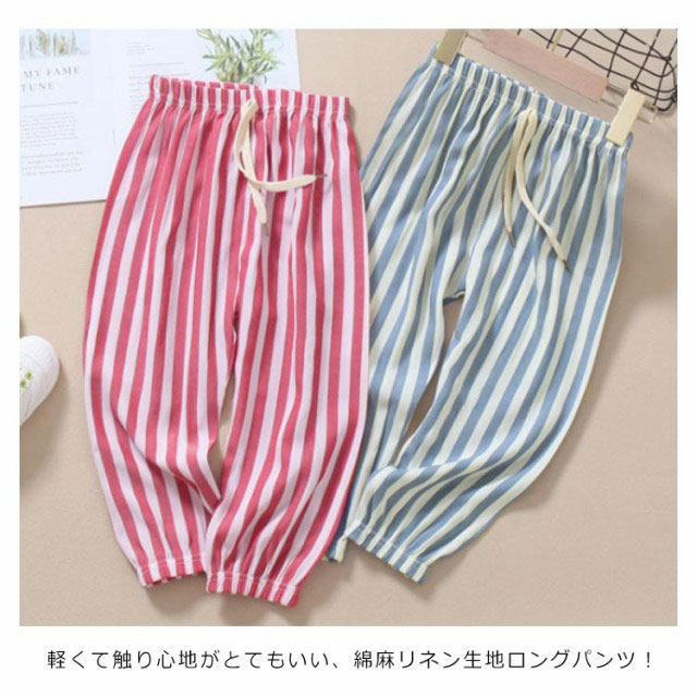 | 透気性が抜群で夏の外室遊びでもムシムシしない。軽くて触り心地がとてもいい、綿麻リネン生地ロングパンツ!通学、通園に半ズボン苦手のお子様に超お勧め?裾口ゴム仕様で蚊にさされない。擦り傷切り傷の防止、防虫、クーラー対策、紫外線カットなど、色々なシーンでお子様の肌を守ってくれます。 | |