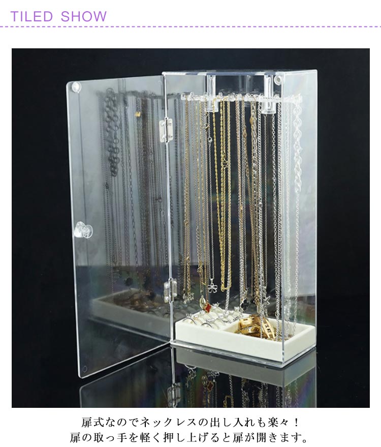 | ネックレスが絡まずに収納出来るだけじゃないっ!お気に入りのジュエリーを、飾って、見せて、便利に収納! 扉式なのでネックレスの出し入れも楽々!扉の取っ手を軽く押し上げると扉が開きます。 フックは回転するので、奥に吊るしたものも取り出しやすくなってます! (底部)収納ケースもついているので、ネックレス以外にもリングやブレスレットなどの小物もまとめて収納できるのが嬉しいですね? 素材は無色?高透明度のアクリル製なので、アクセサリーを見せながら収納できインテリアとして最適です。 透明度が高く、シンプルなデザインなのでネックレスを入れて飾っておくだけで お部屋のインテリアにも! 24本のフック付き!最大72本ネックレスがかけられます。 | |