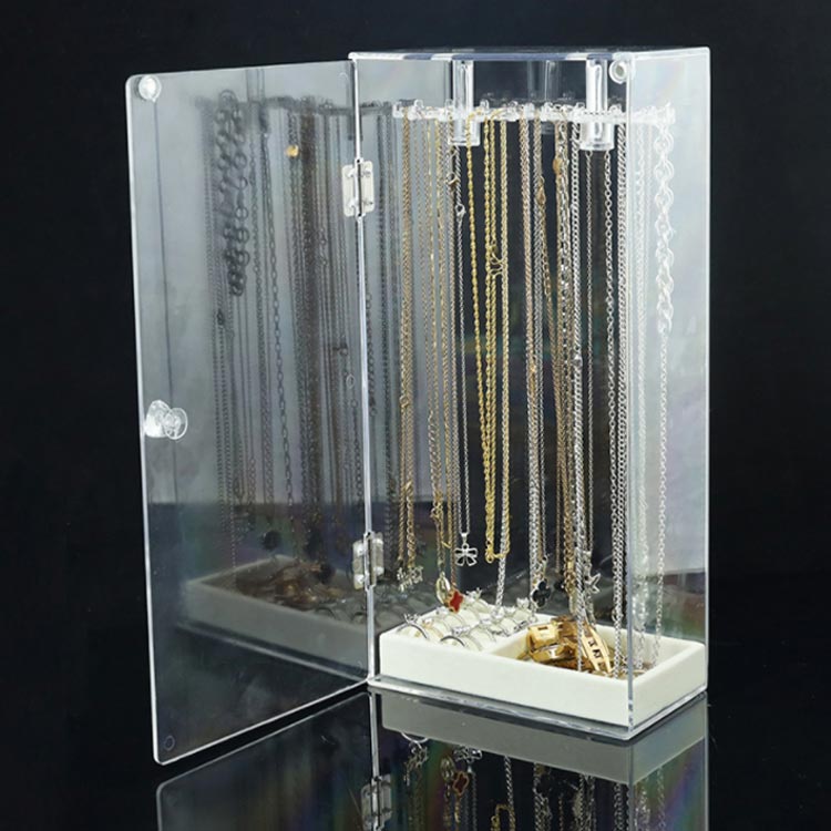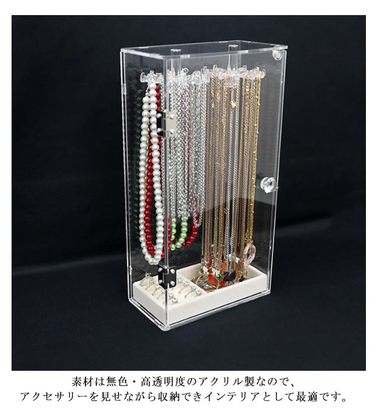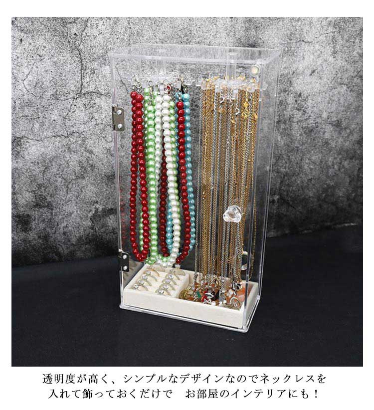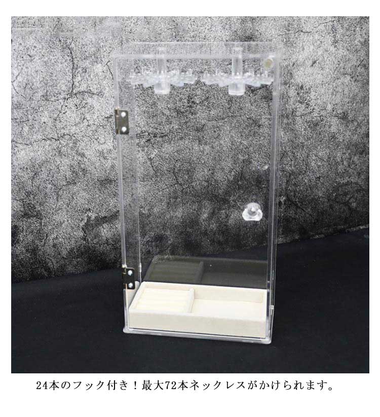 ネックレスが絡まずに収納出来るだけじゃないっ!お気に入りのジュエリーを、飾って、見せて、便利に収納!扉式なのでネックレスの出し入れも楽々!扉の取っ手を軽く押し上げると扉が開きます。フックは回転するので、奥に吊るしたものも取り出しやすくなってます!(底部)収納ケースもついているので、ネックレス以外にもリングやブレスレットなどの小物もまとめて収納できるのが嬉しいですね♪素材は無色・高透明度のアクリル製なので、アクセサリーを見せながら収納できインテリアとして最適です。透明度が高く、シンプルなデザインなのでネックレスを入れて飾っておくだけで お部屋のインテリアにも!24本のフック付き!最大72本ネックレスがかけられます。
