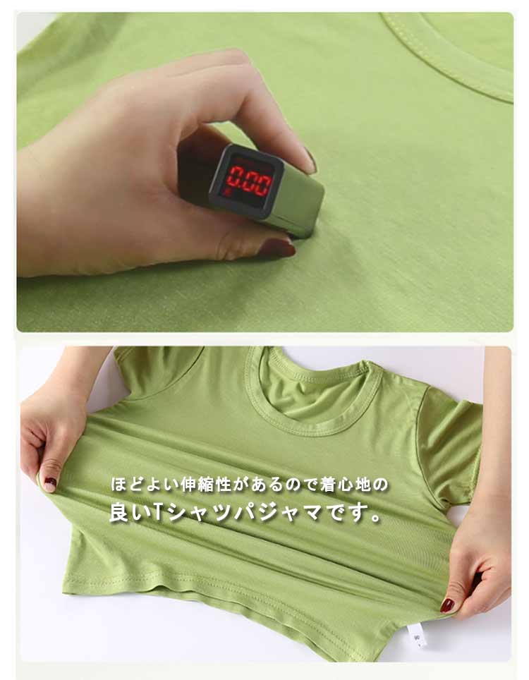 | 半袖とハーフパンツとの上下セット。 ほどよい伸縮性があるので着心地の良いTシャツパジャマです。 肌触りの良い柔らかな風合いが特徴です。 パジャマとしてはもちろん、部屋着として着用しても可愛い! 伸縮性が抜群で動きやすいので、日中のおうち時間も、夜のおやすみ中もパジャマとしてノンストレスで快適に過ごせます。 | |